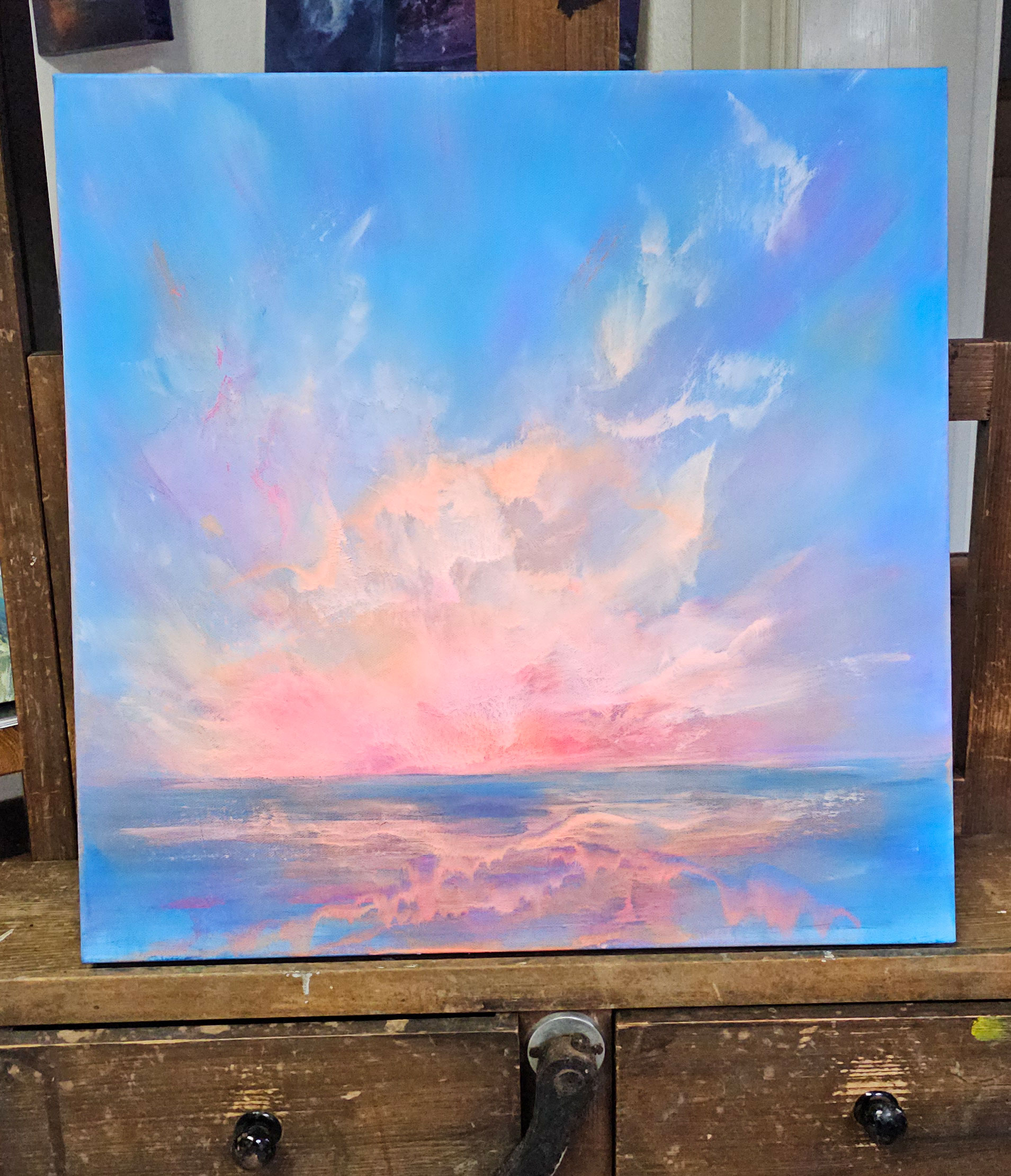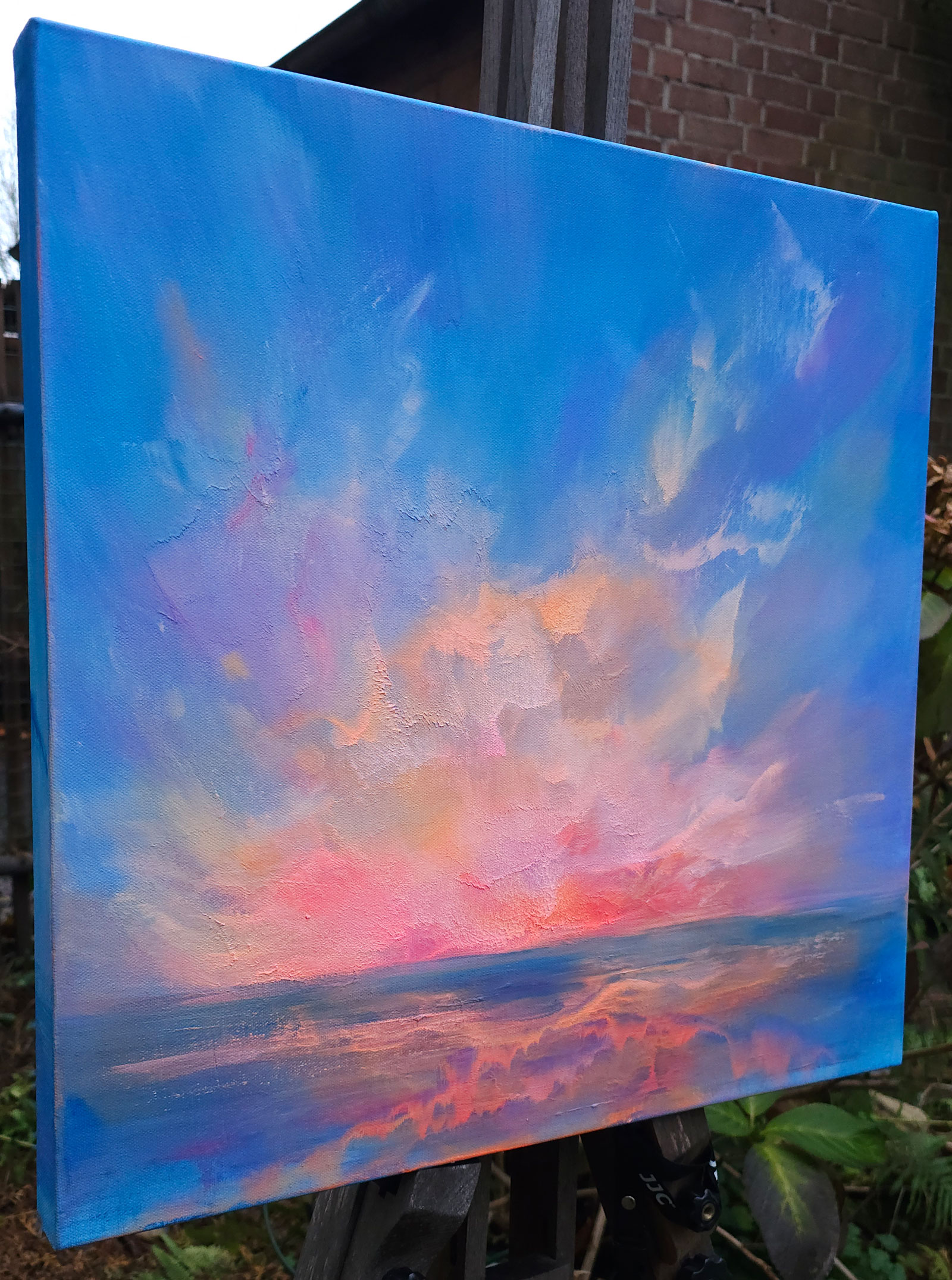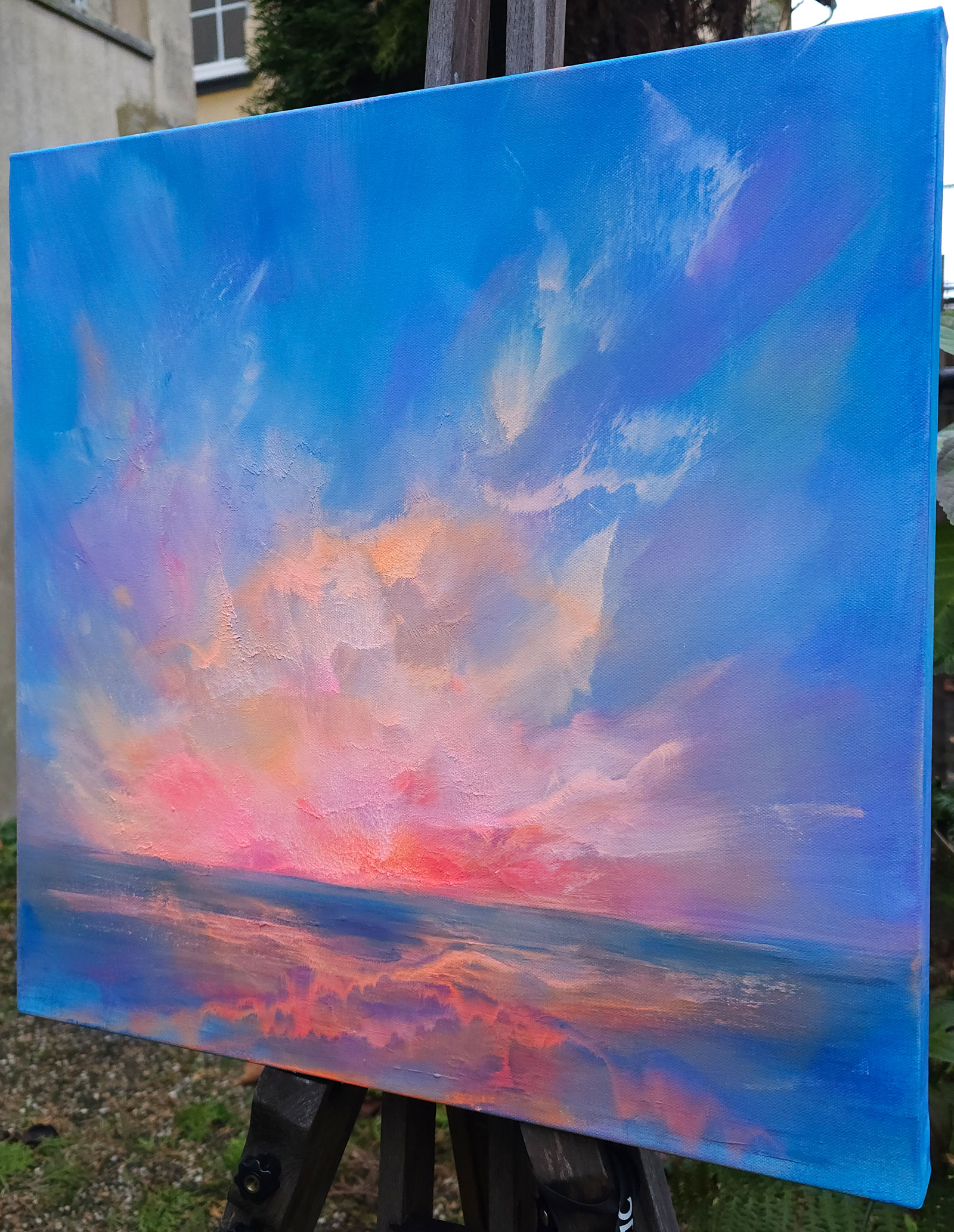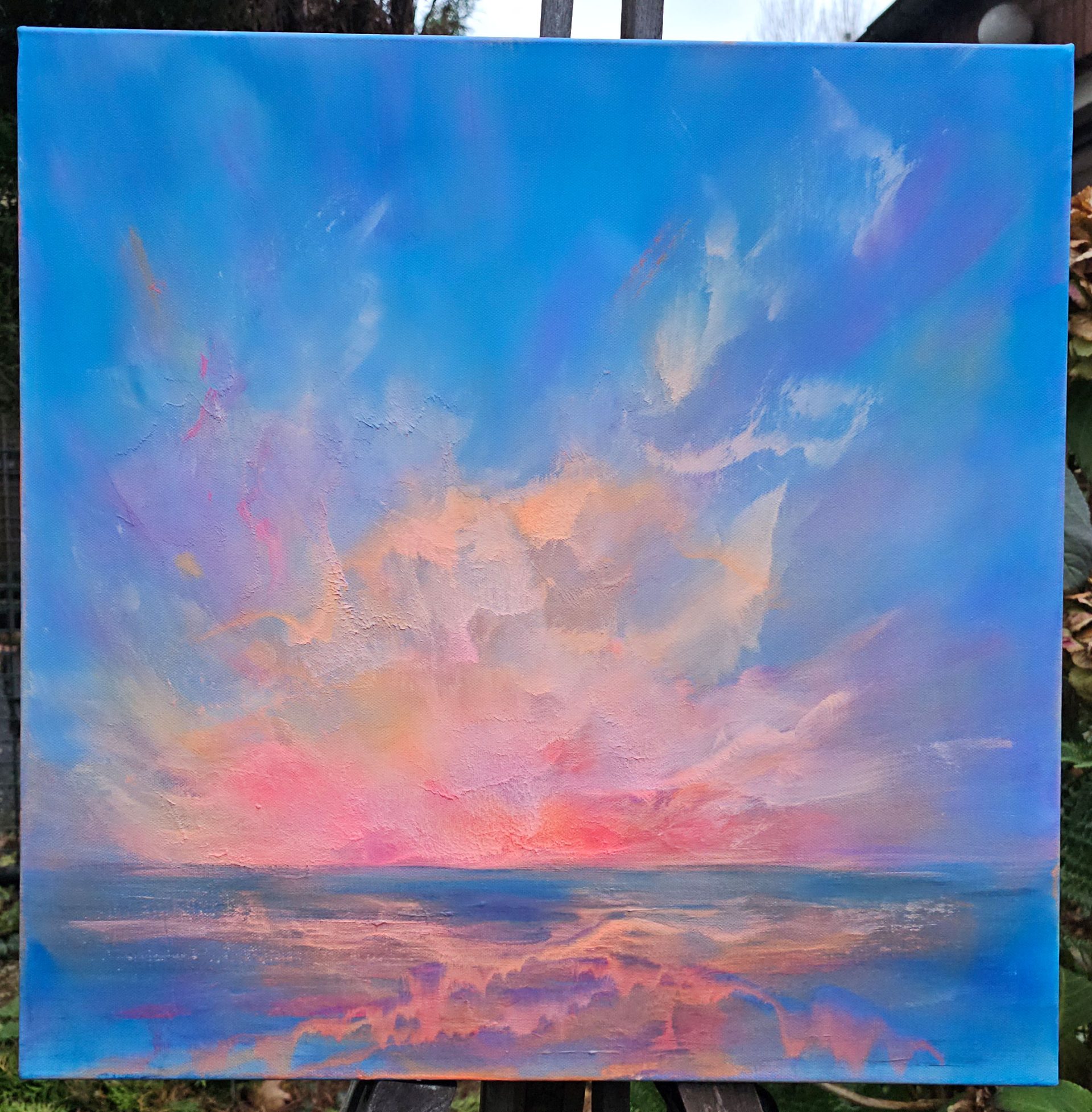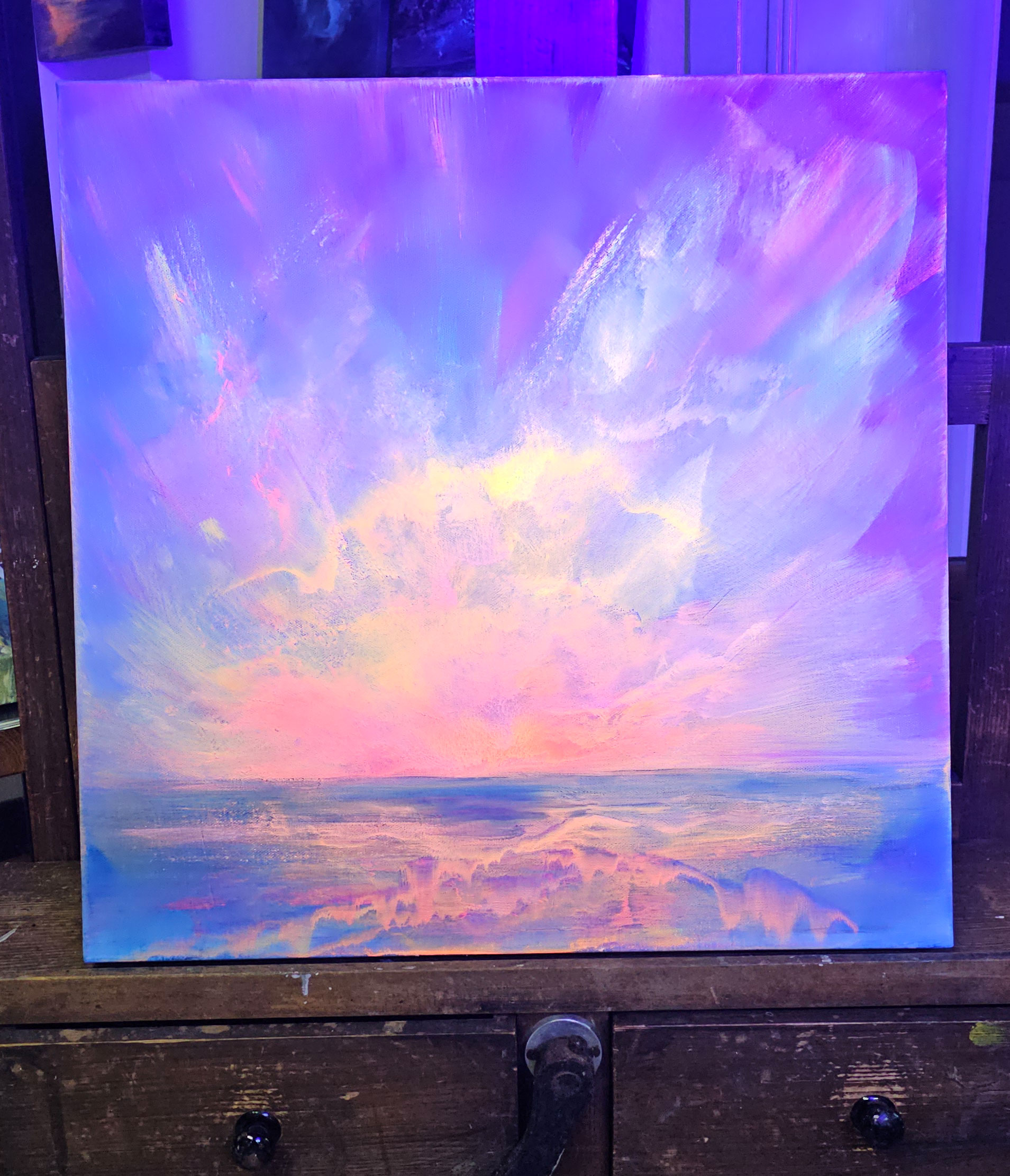 Ein weiches Leuchten breitet sich über Meer und Himmel aus, Rosa, Blau, Flieder und zarte Orange-Töne verschmelzen zu einer ruhigen, fast schwebenden Atmosphäre. Die fluoreszierenden Akzente lassen das Licht lebendiger wirken, als würde der Moment über den Horizont hinaus pulsieren.