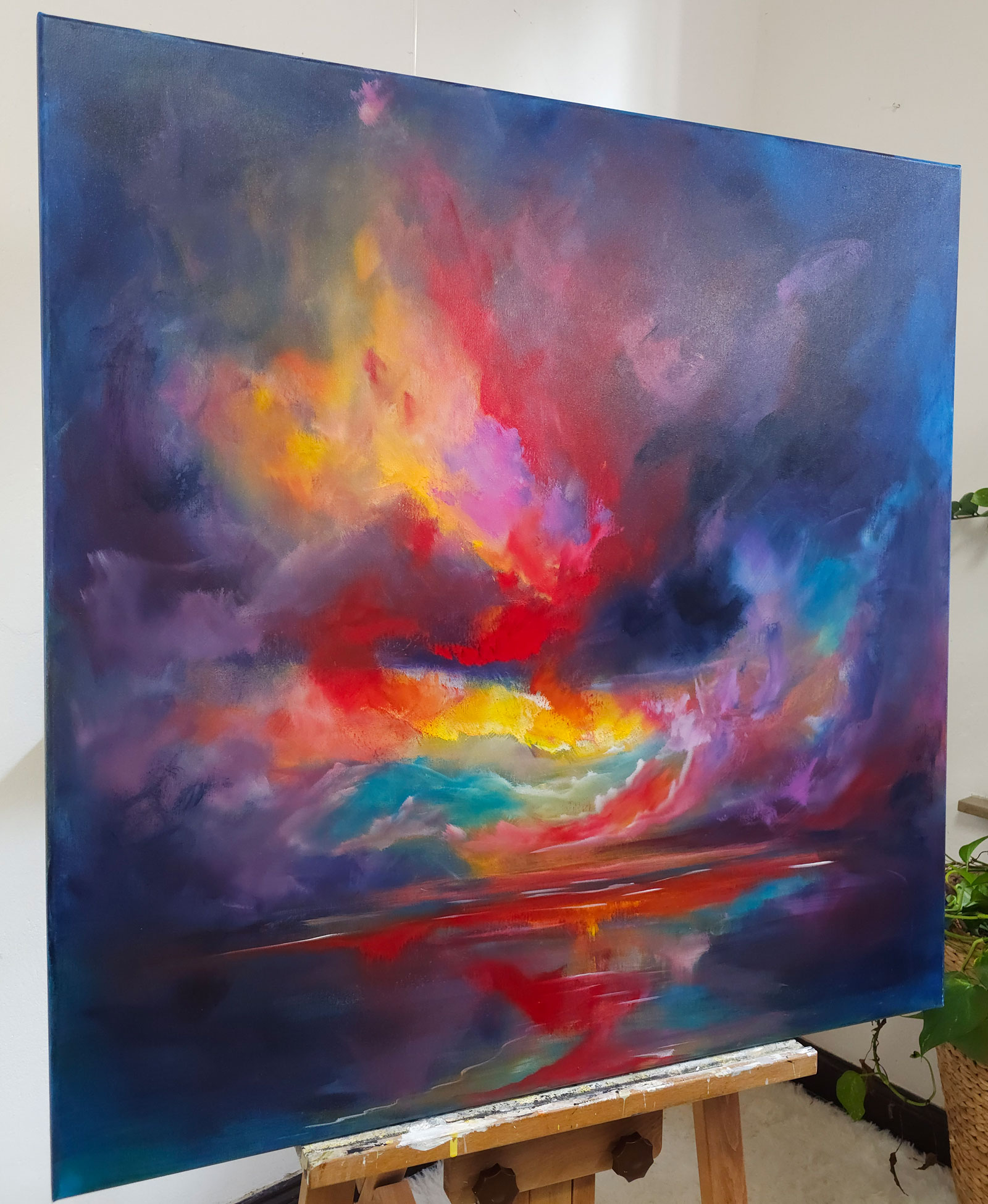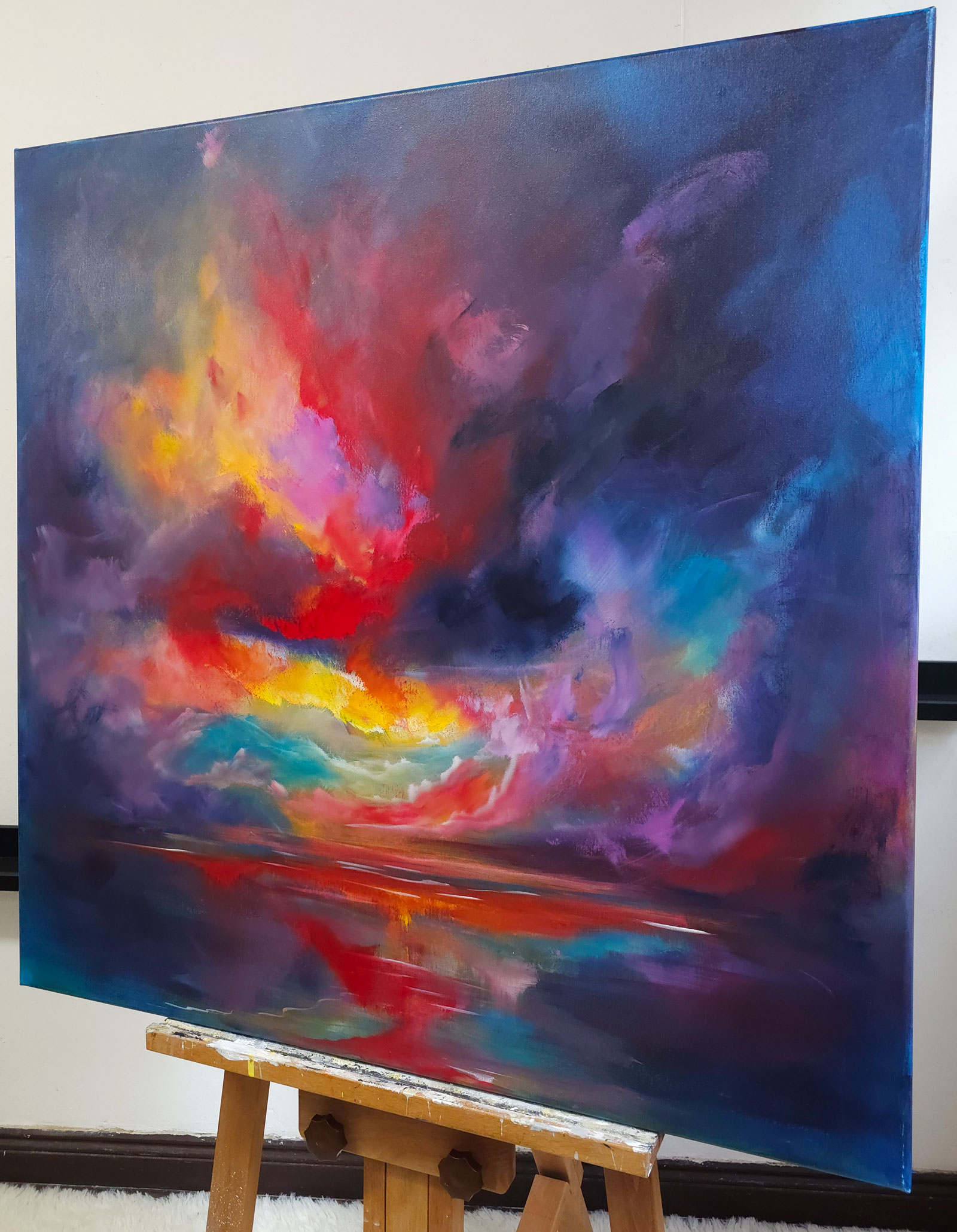 Tauchen Sie ein in ein farbgewaltiges Traumland: Dieses eindrucksvolle Acrylgemälde im Format 100 x 100 cm entfaltet ein faszinierendes Farbspiel aus leuchtendem Rot, Gelb, Violett und Türkis. Die dramatisch bewegten Farbverläufe erinnern an einen fantastischen Sonnenuntergang oder eine kosmische Lichtlandschaft – voller Energie, Emotion und Tiefe. Die reflektierenden Strukturen am unteren Rand lassen an Wasser denken und verleihen dem Bild eine ruhige Balance zur Dynamik des Himmels.