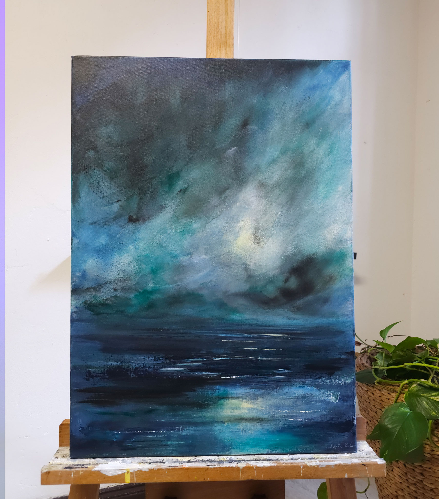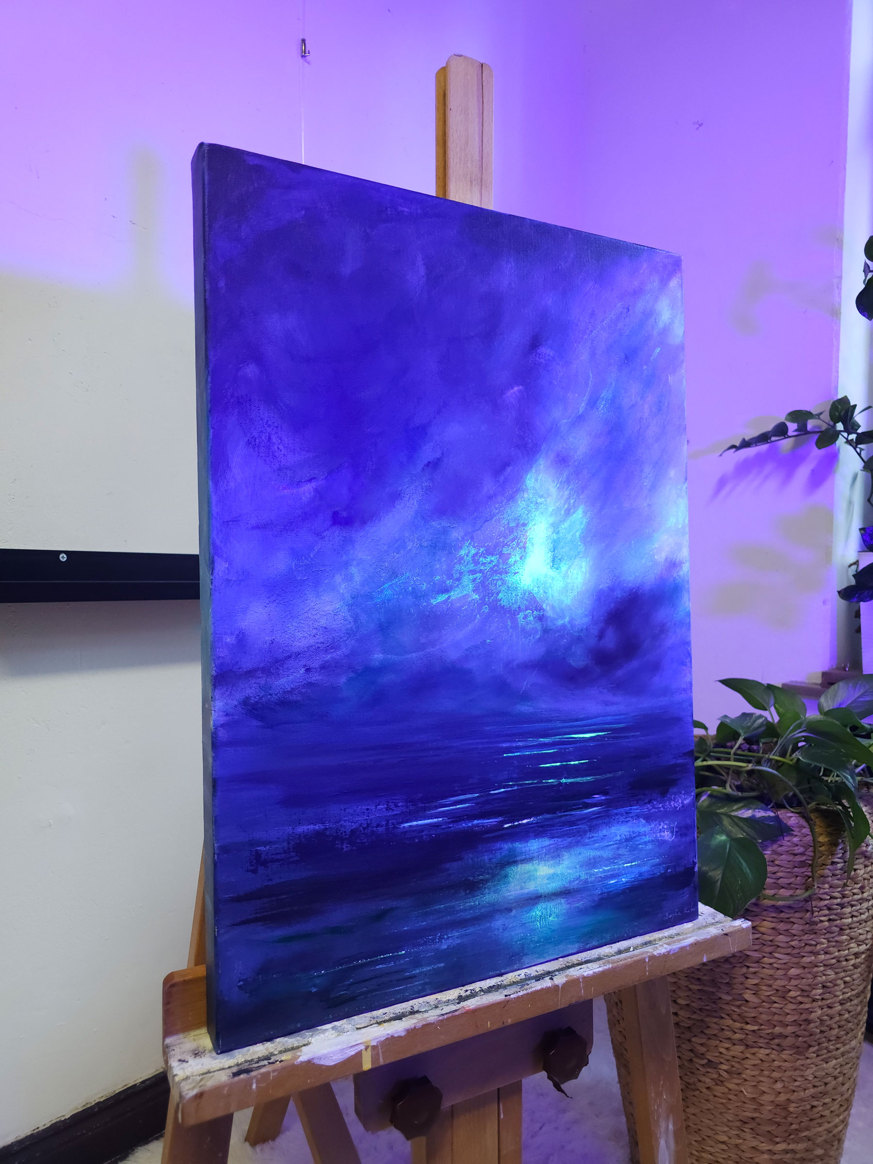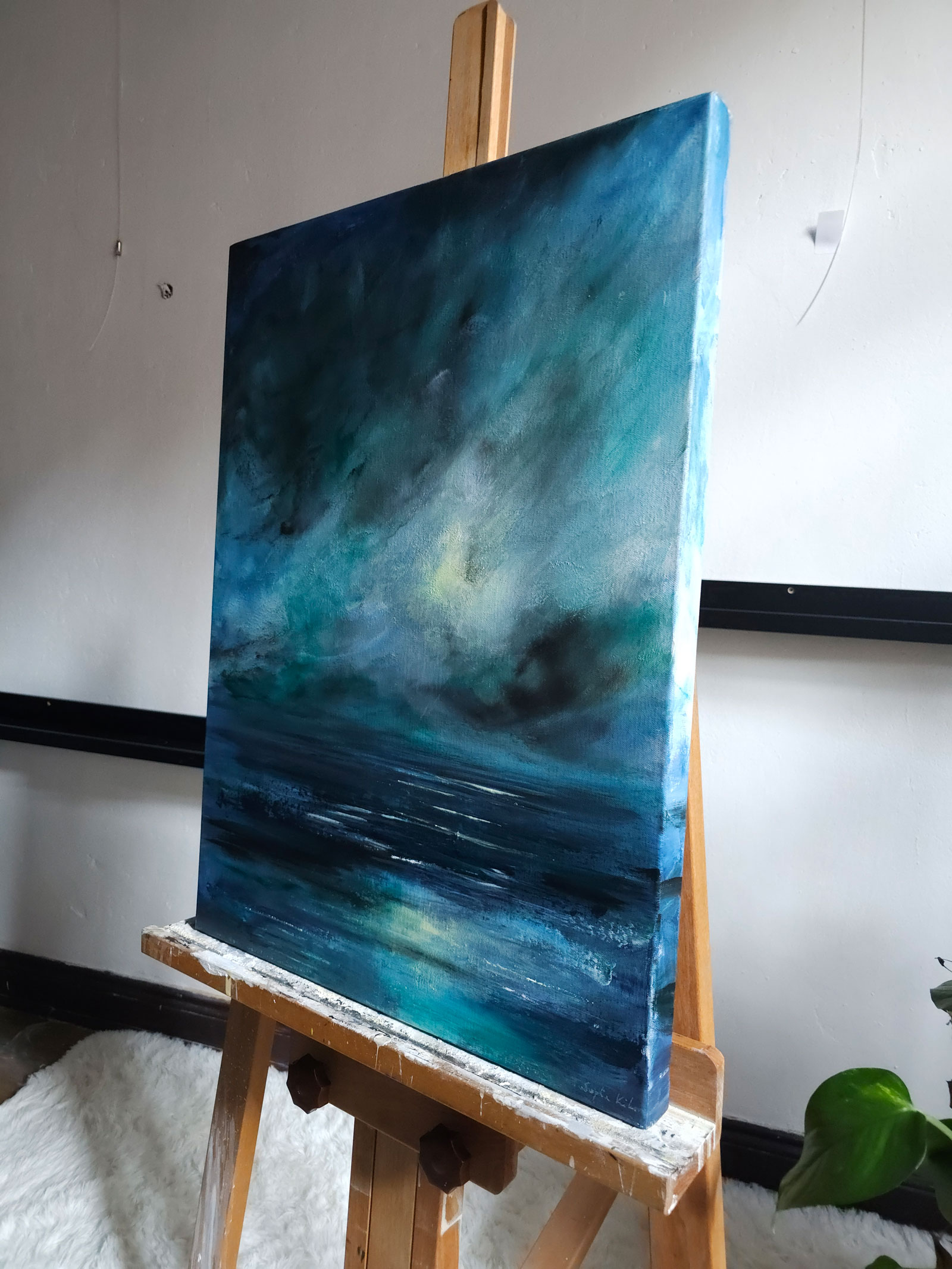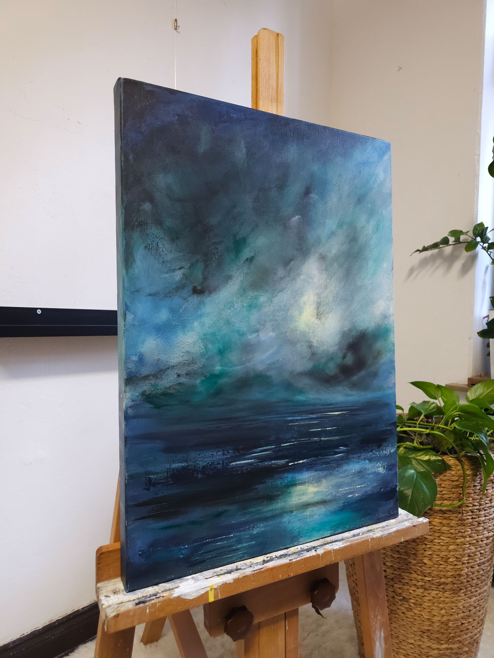 Glow ist ein atmosphärisches Gemälde, das Dunkelheit nicht als Ende, sondern als Raum für Licht versteht. In tiefen Blau- und Grautönen spannt sich ein schwerer Himmel über eine ruhige Wasserfläche. Der Horizont scheint sich aufzulösen – zugunsten eines sanften, geheimnisvollen Leuchtens, das sowohl aus der Tiefe als auch aus dem Himmel selbst zu kommen scheint.