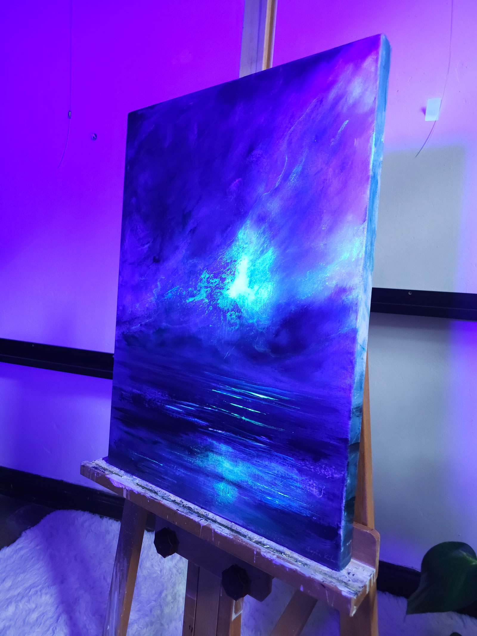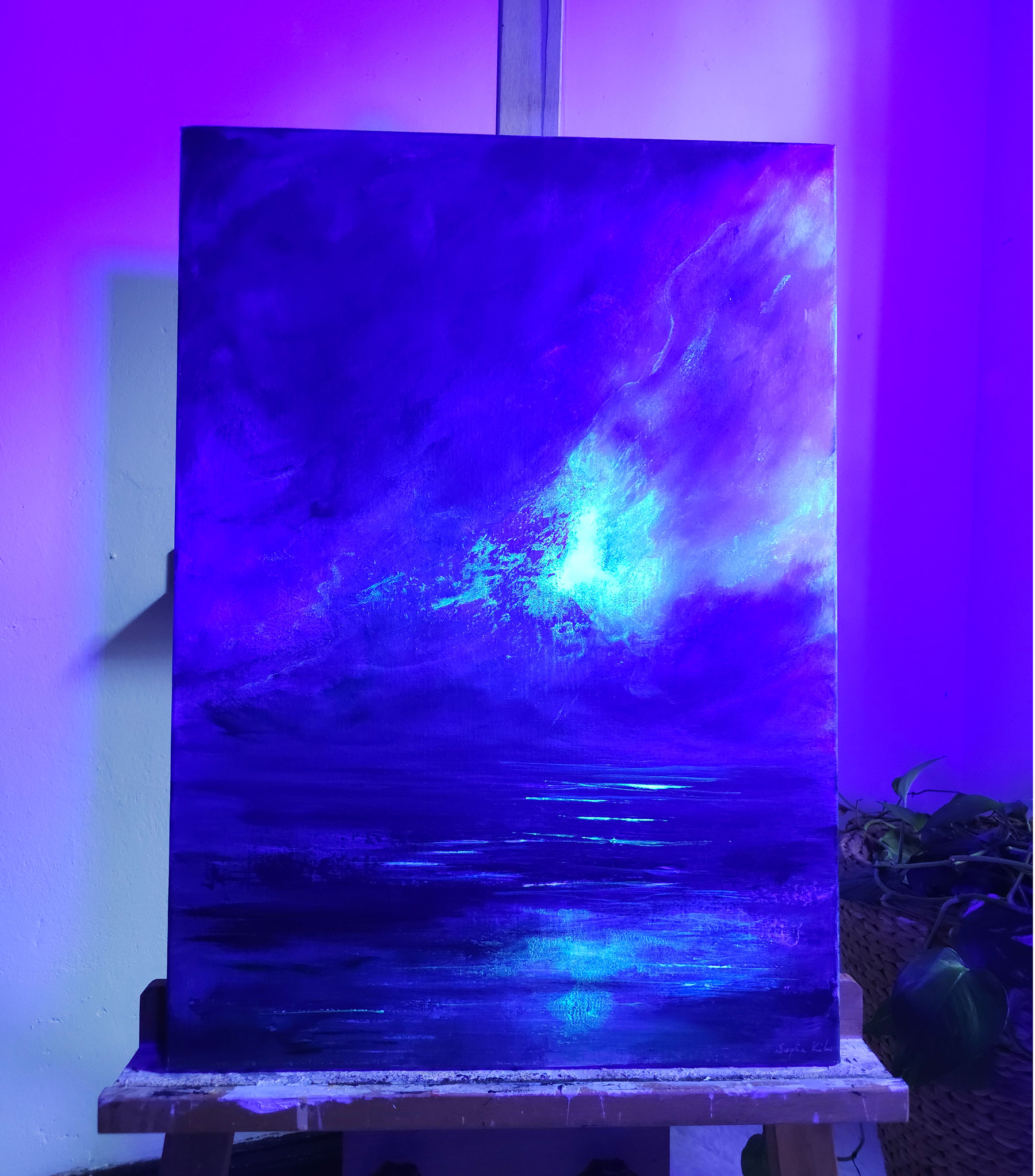 Ein besonderes Element bildet die Verwendung von phosphoreszierender Farbe: Bestimmte Partien laden sich im Licht auf und beginnen im Dunkeln zu leuchten – als würde das Bild auch dann noch sprechen, wenn alles andere schweigt. Dieses Leuchten wirkt wie ein inneres Licht, das sich nicht sofort offenbart, sondern nachwirkt – still, beständig, fast spirituell.