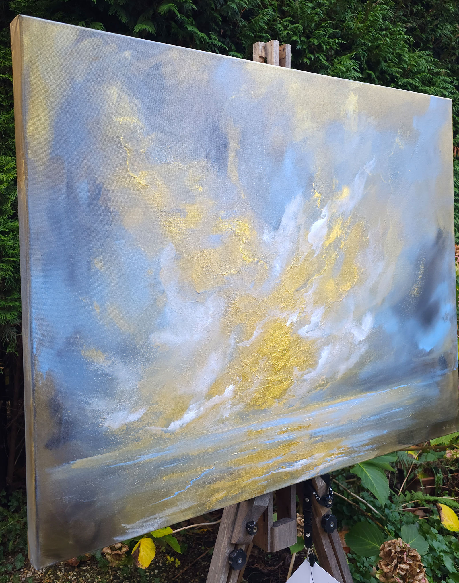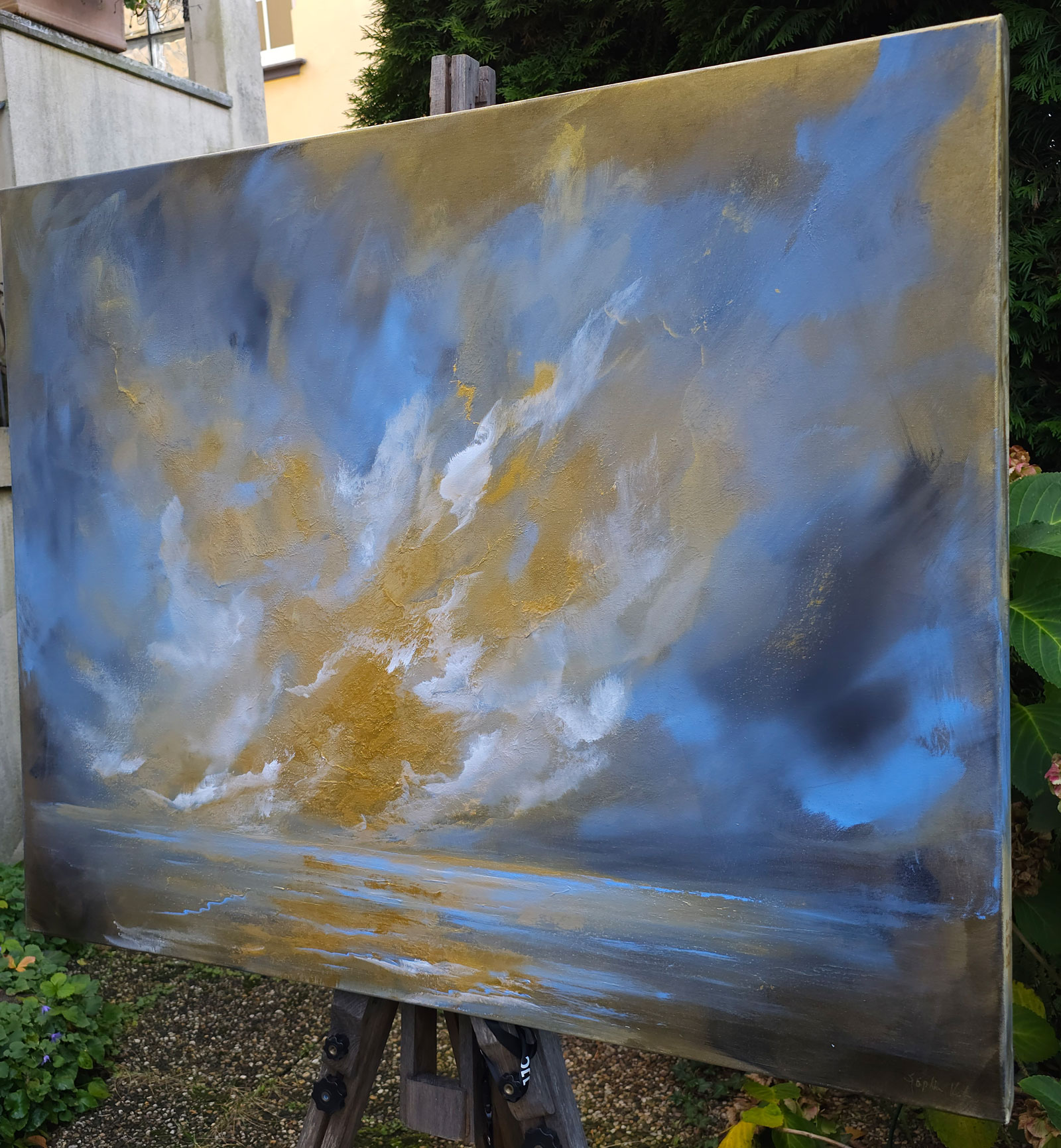 Ein kraftvolles Spiel aus Licht und Tiefe. Goldene Strukturen brechen aus den kühlen Blautönen hervor und reflektieren das Licht in immer neuen Facetten. Das Gemälde fängt den Moment ein, in dem Himmel und Meer ineinander übergehen – ruhig, leuchtend, und voller Energie. Je nach Lichteinfall verändert sich die Oberfläche und offenbart neue Nuancen, wie ein lebendiger Dialog zwischen Farbe, Struktur und Emotion.