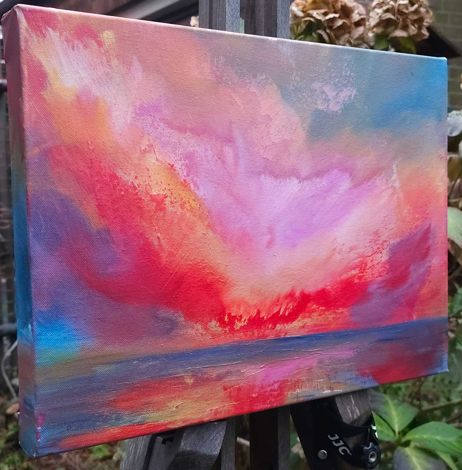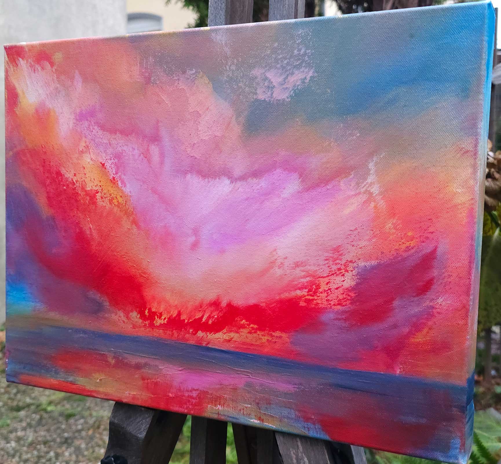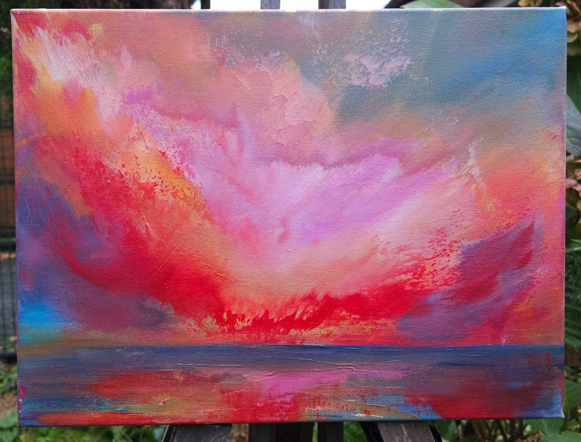 Ein leuchtendes Zentrum aus Rot, Rosa und Gold entfaltet sich über dem Meer, wie ein Puls aus Licht und Emotion. Das Bild scheint zu atmen, zwischen Kraft und Zartheit, Intensität und Weite.