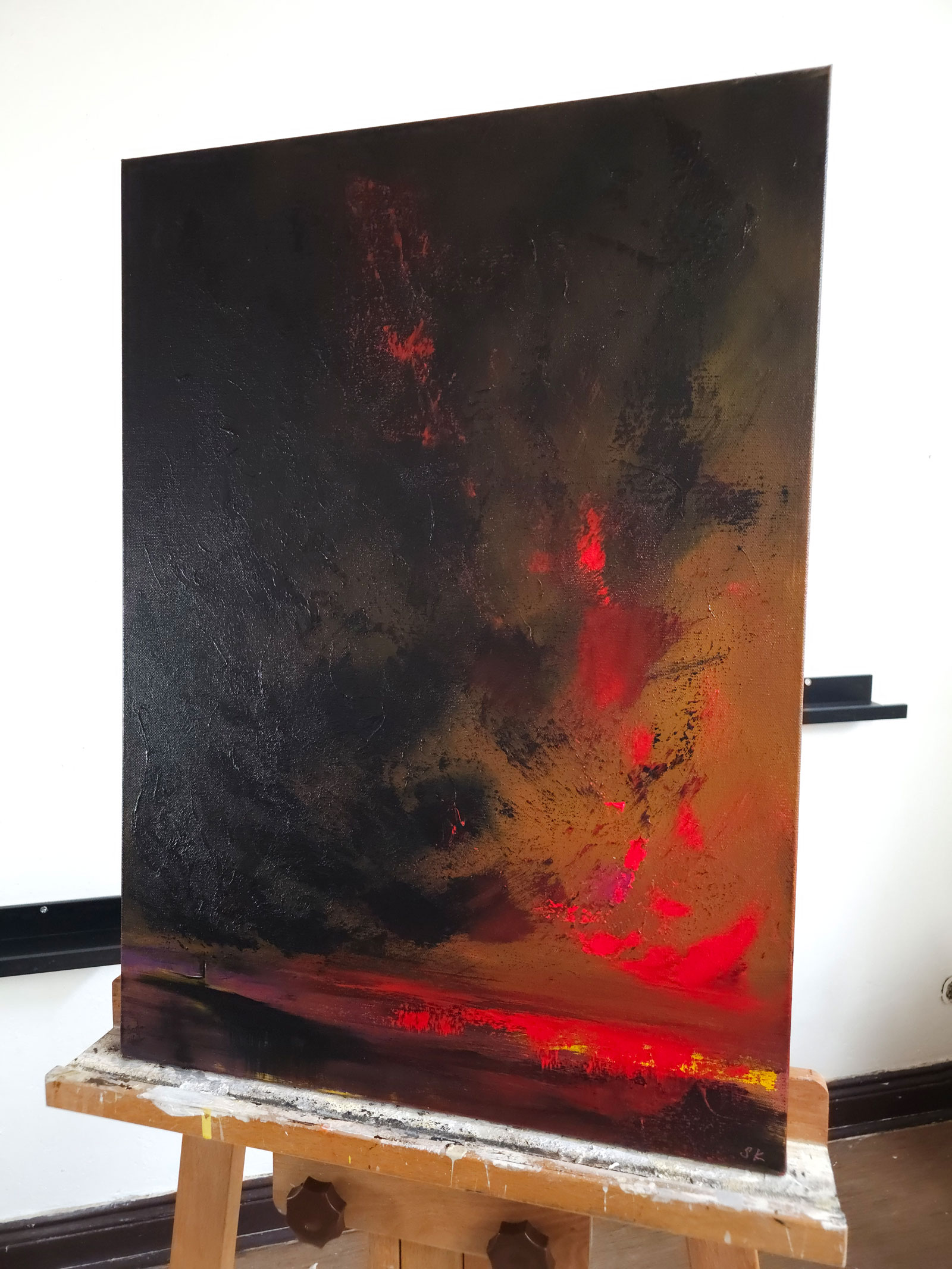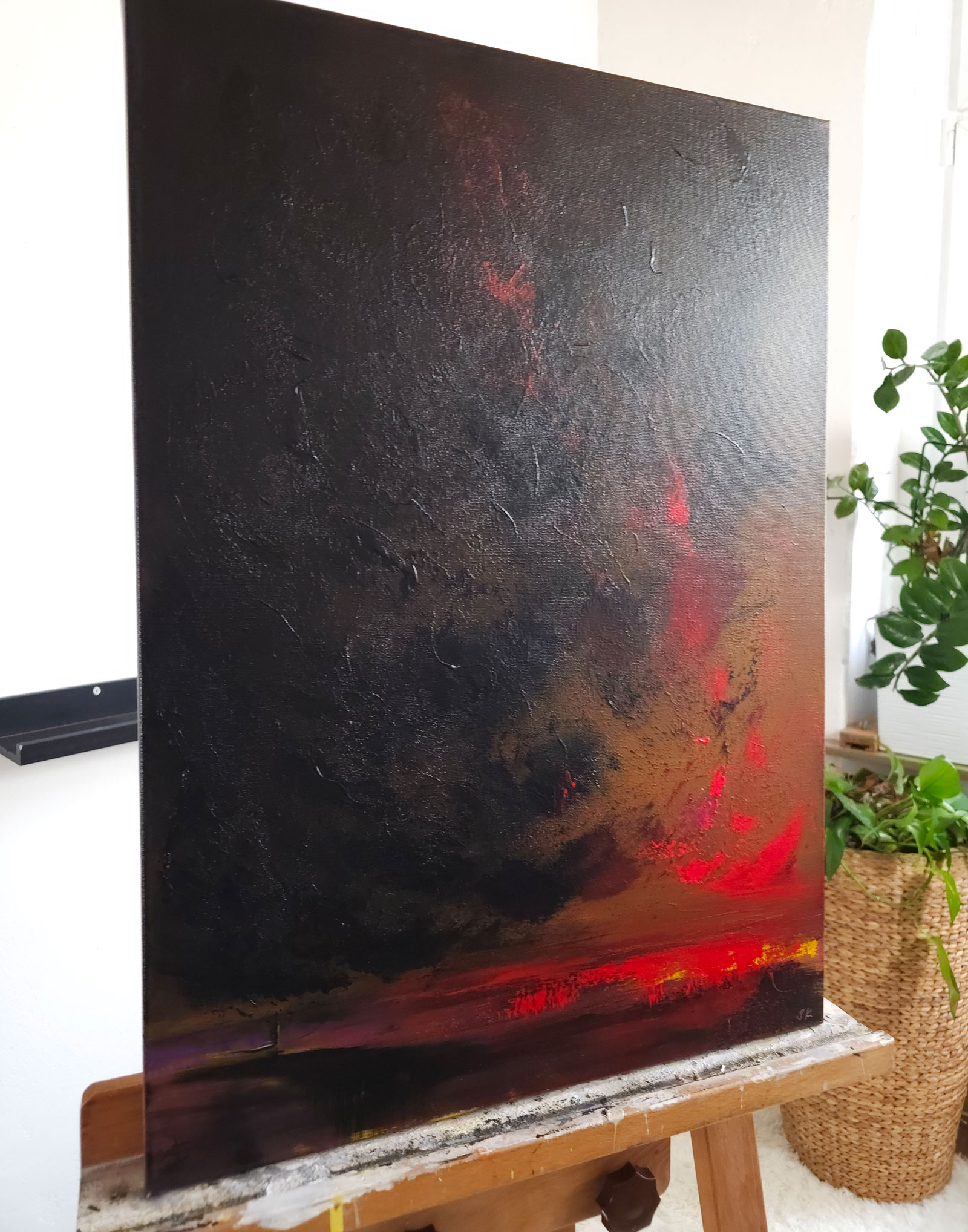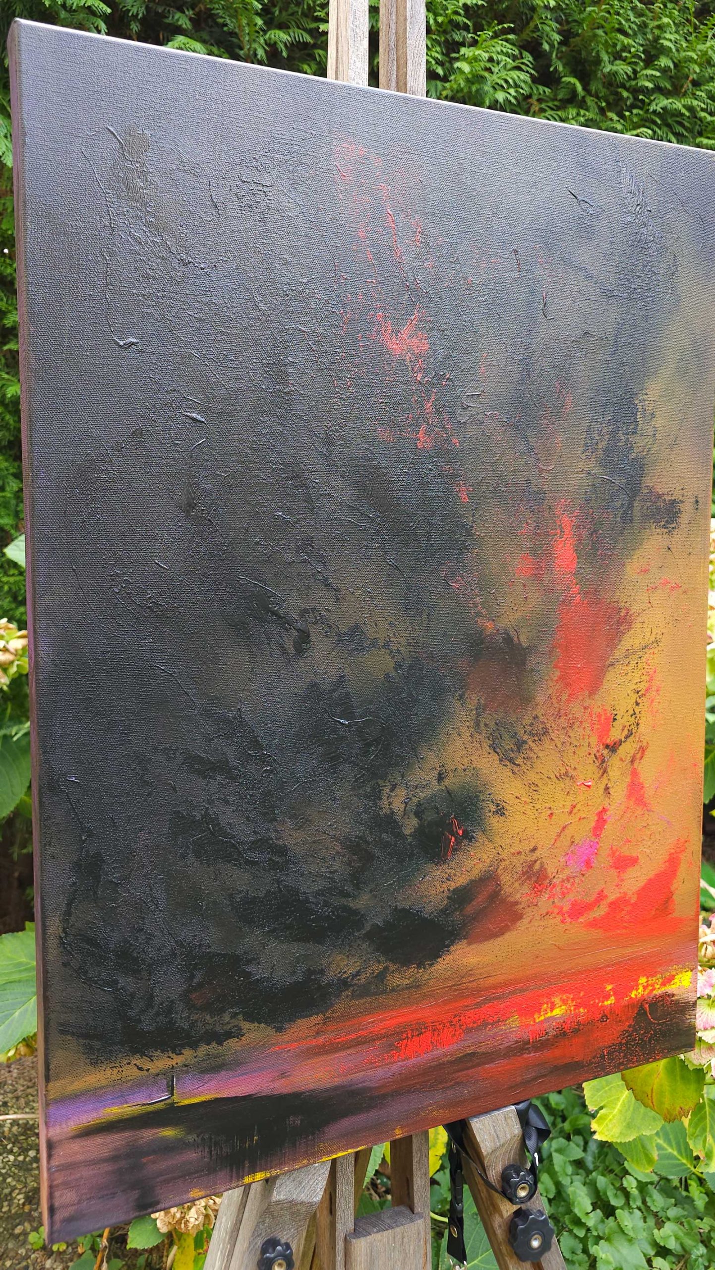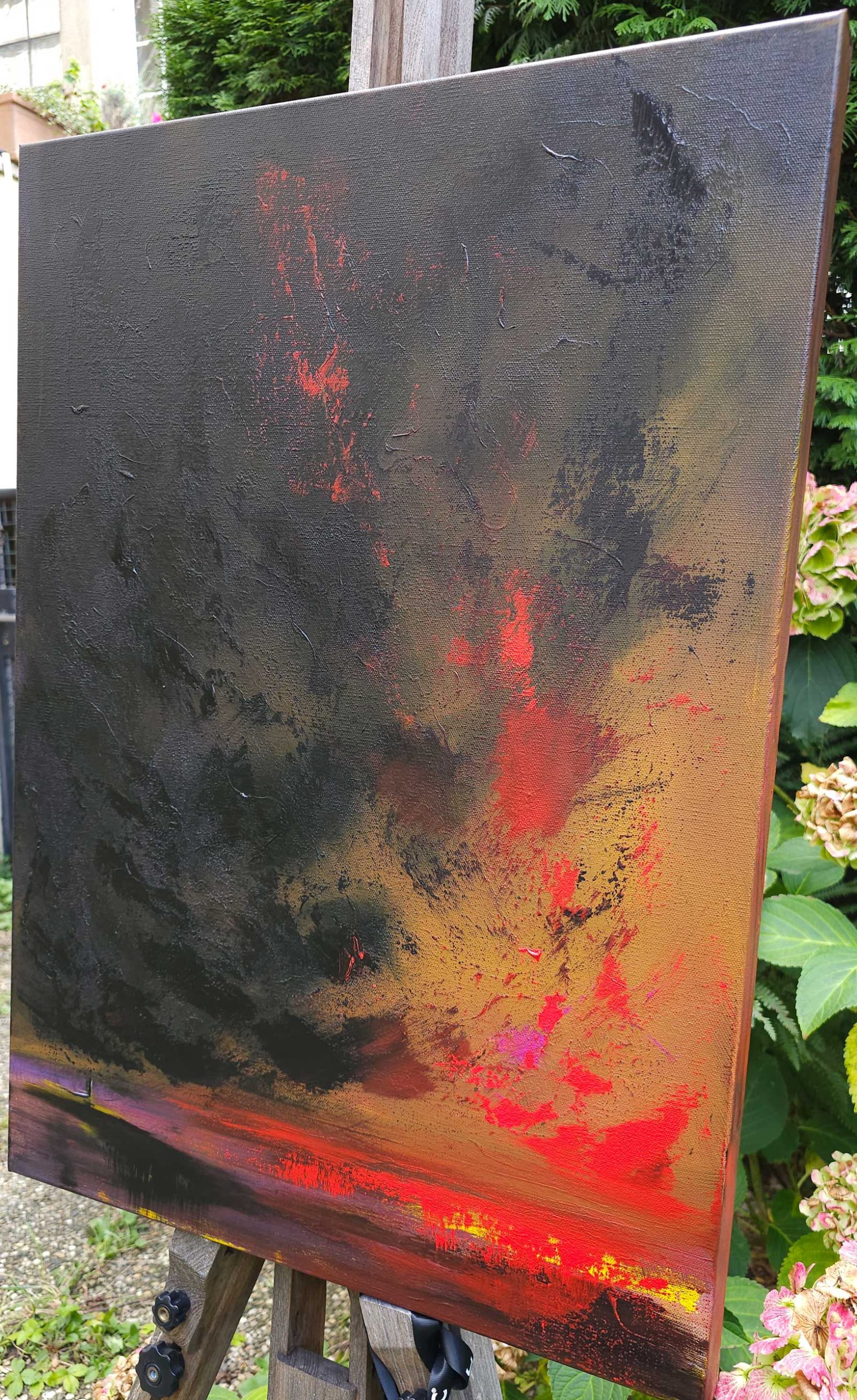 Ein Himmel voller Spannung: Dichte, schwarze Wolken breiten sich wie schwere Gedanken aus, während darunter das Feuer in leuchtendem Rot und Gold hervorbricht. Am Rand steht eine einzelne Figur – klein und verletzlich, und doch präsent. Sie verkörpert den inneren Kampf: die Wut, die Dunkelheit, das Ringen darum, ob man darin gefangen bleibt oder den Ausbruch wagt.