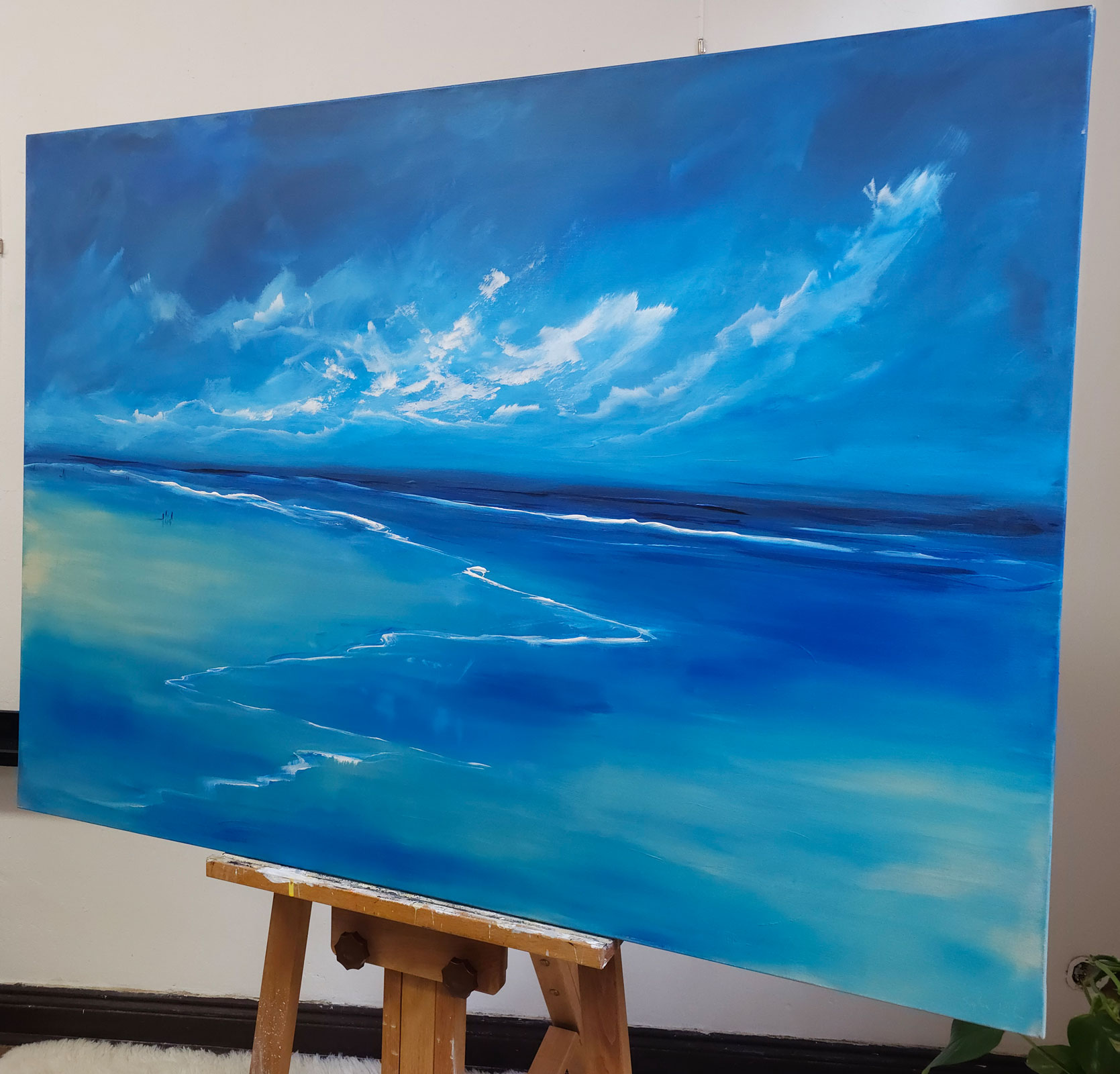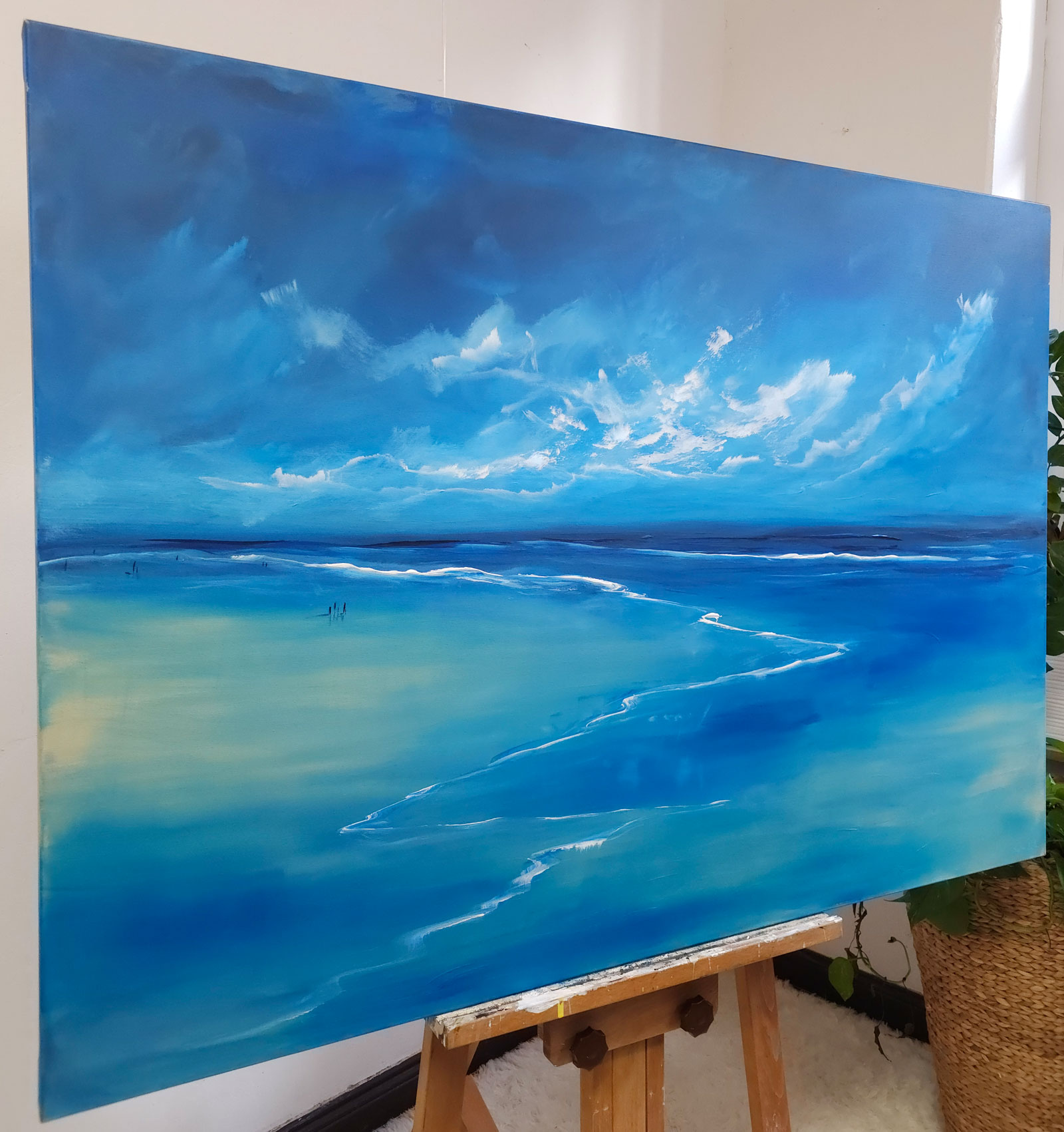 Ein weiter Horizont, Wasser und ein Himmel voller Bewegung – Salt on My Skin fängt die ruhige Weite der Atlantikküste in einer kraftvollen, fast meditativen Szene ein. Der Blick verliert sich in Blautönen, feinen Lichtreflexen und sanft auslaufenden Wellen. Kleine, angedeutete Figuren in der Ferne unterstreichen das Gefühl von Freiheit und Raum.