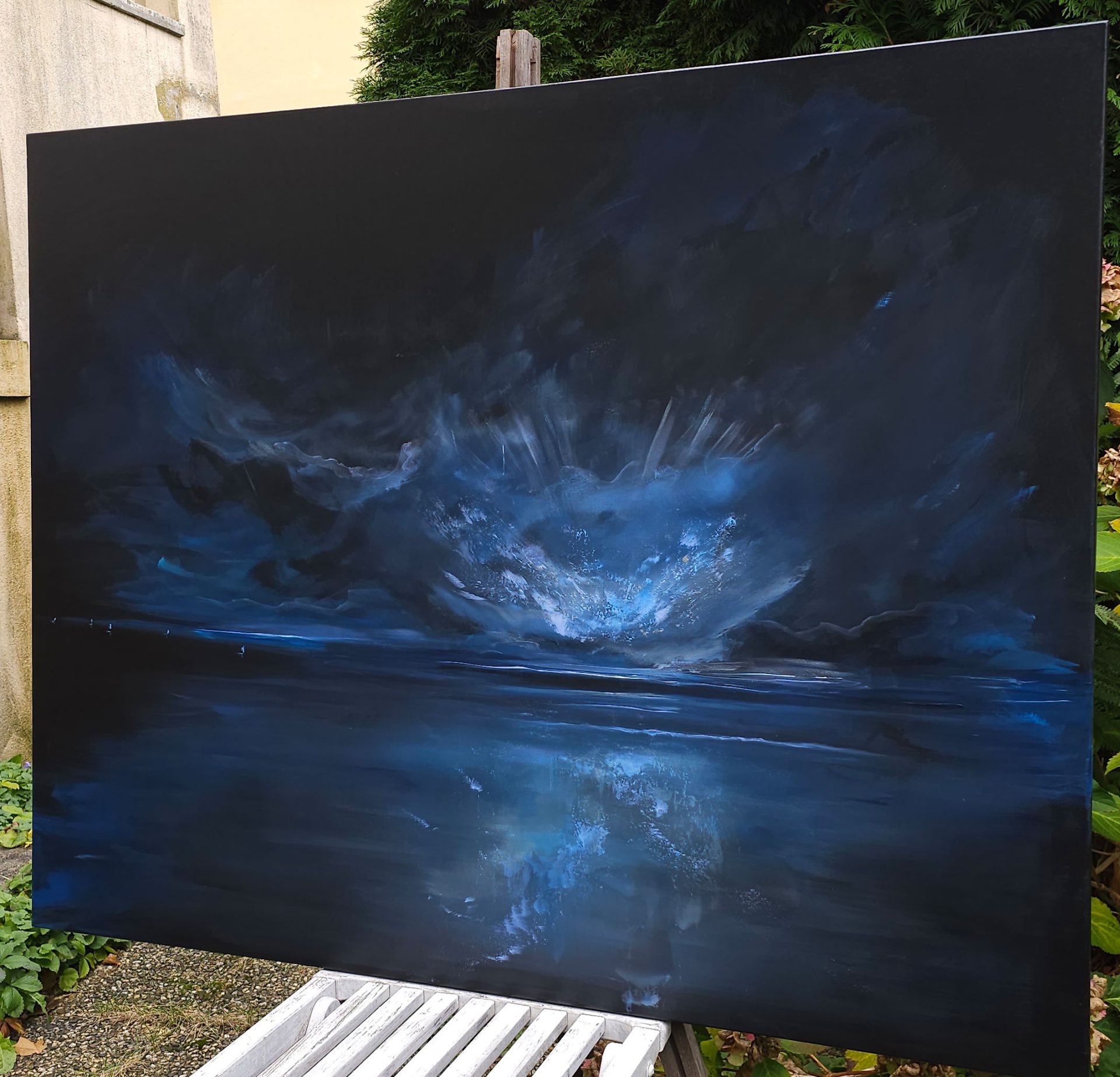 Durch die partiell eingesetzte fluoreszierende Farbe beginnt dieses Leuchten im Dunkeln selbstständig zu strahlen – als würde die Nacht ein eigenes Licht in sich tragen. Die Wirkung ist subtil, aber tief: Das Bild verändert sich mit dem Licht, bleibt lebendig, bleibt in Bewegung.