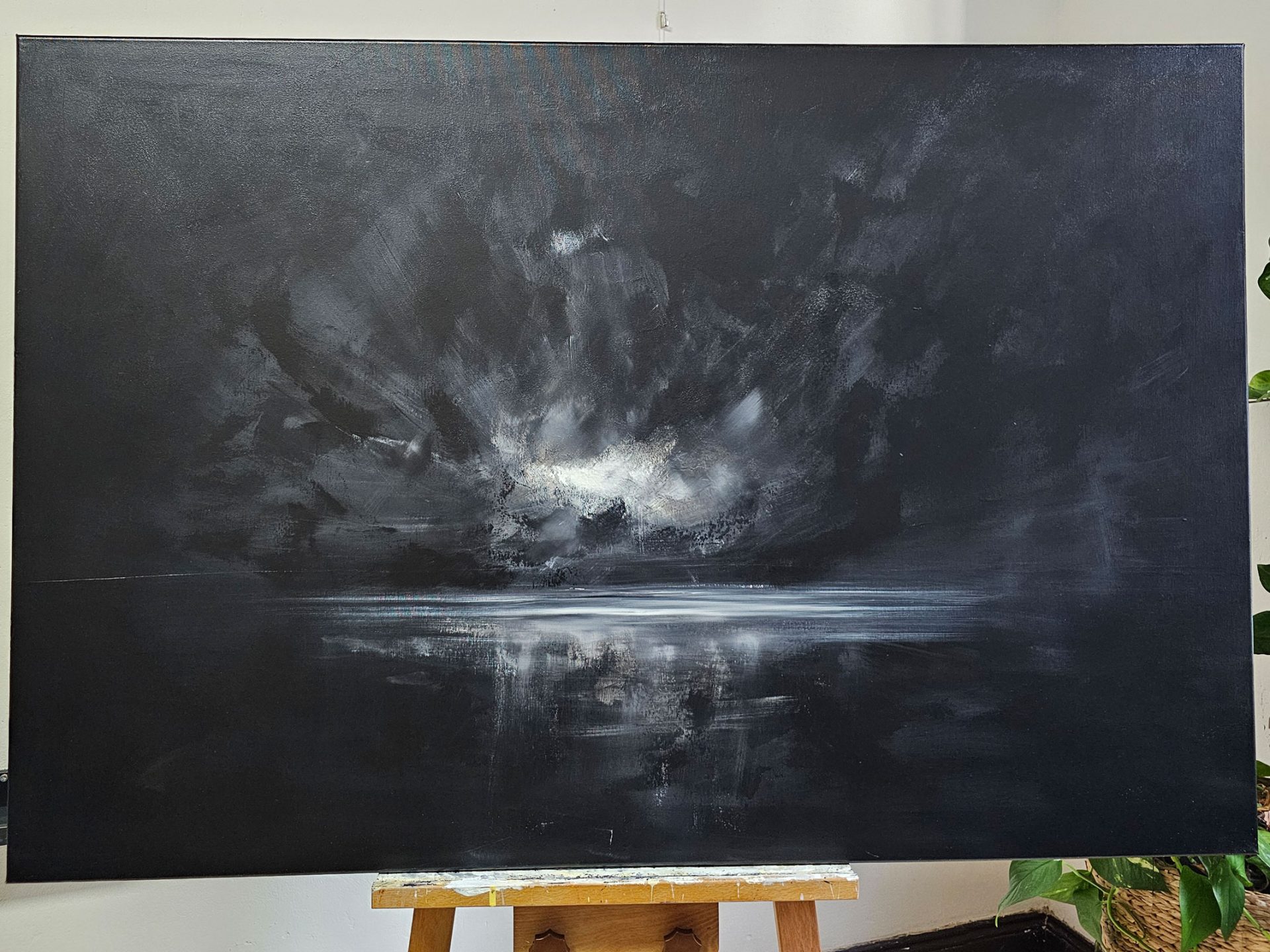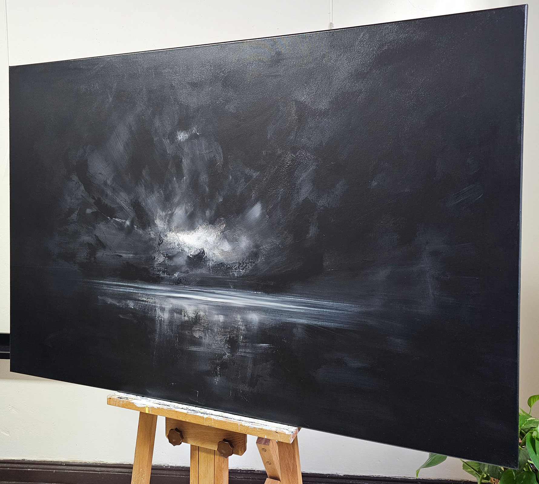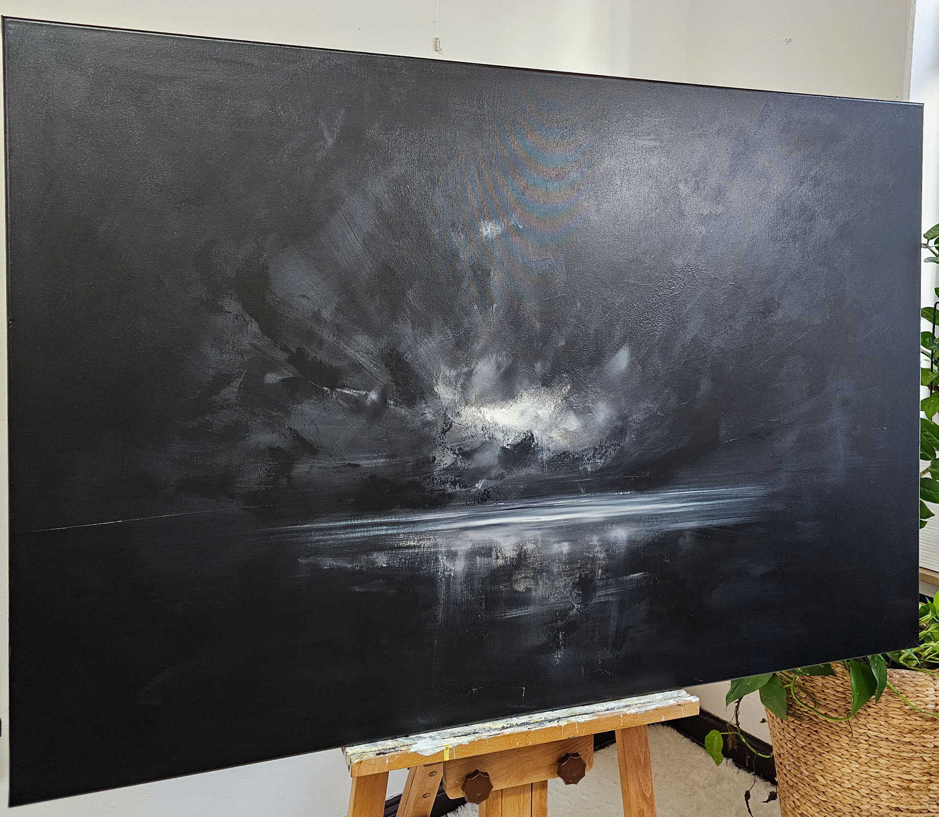 Shadows in the Sky ist ein kraftvolles Acrylgemälde im Panoramaformat 100 x 150 cm, das die Essenz von Dunkelheit und Licht in einer dramatisch minimalistischen Atmosphäre einfängt. Die Komposition lebt von nuancierten Schwarztönen, Nebelgrau und kühlen Lichtreflexen, die wie ein geheimnisvoller Horizont durch die Dunkelheit brechen.