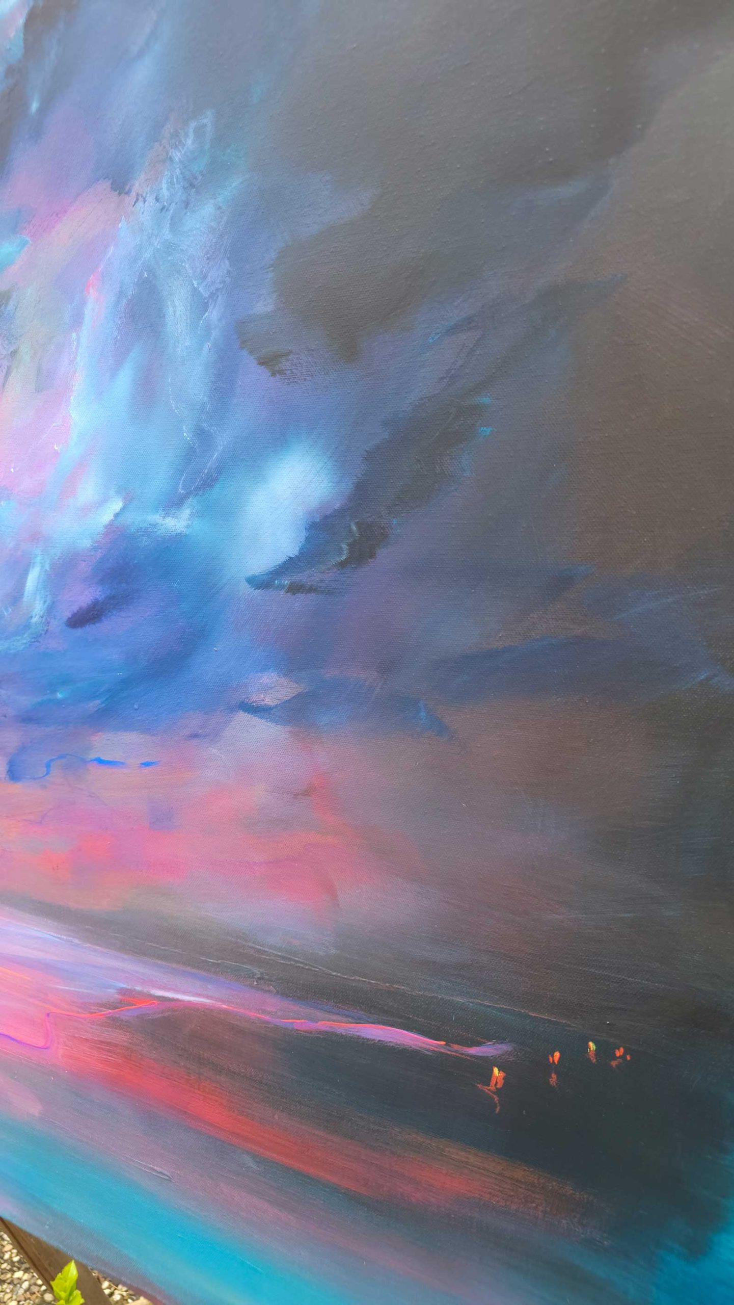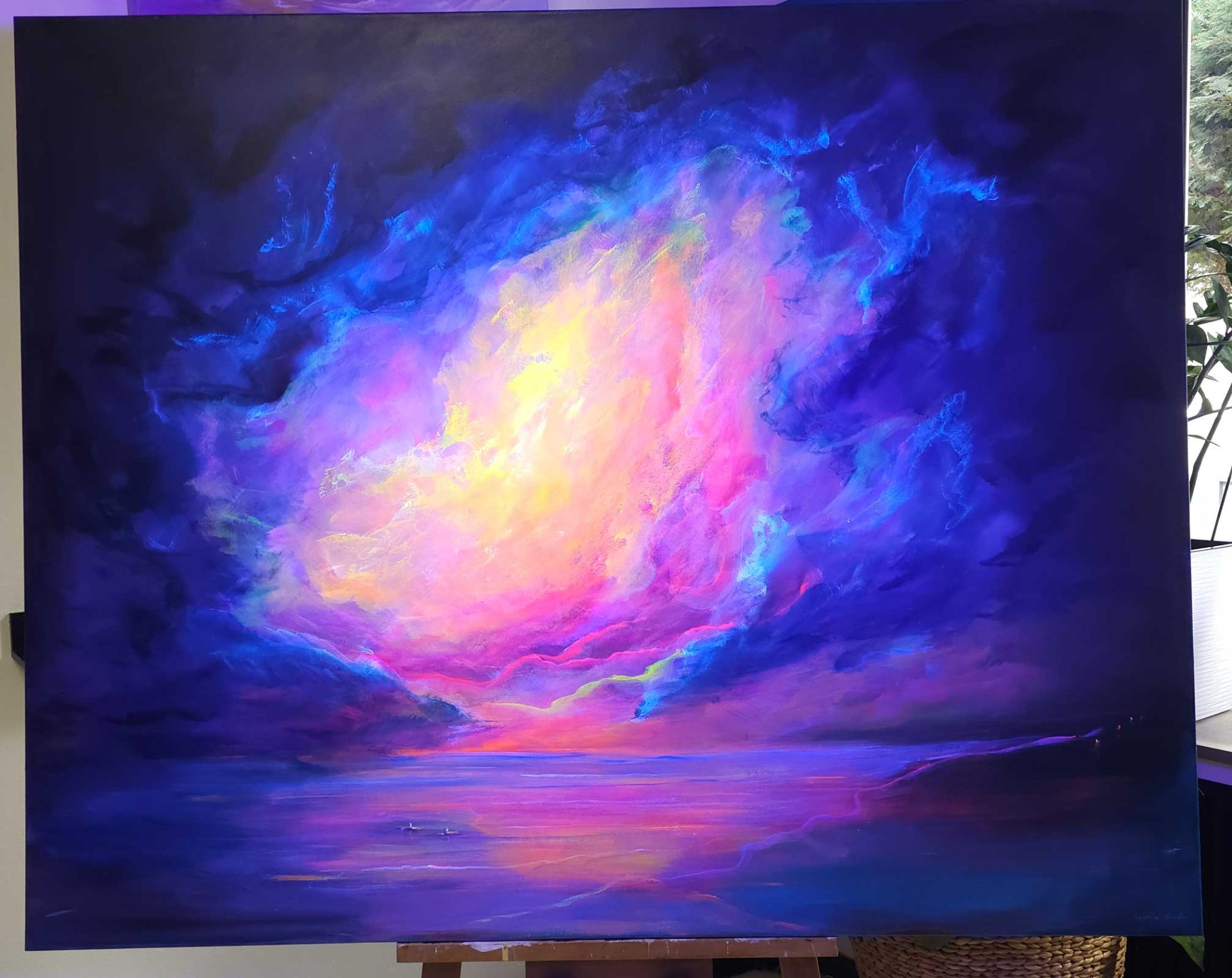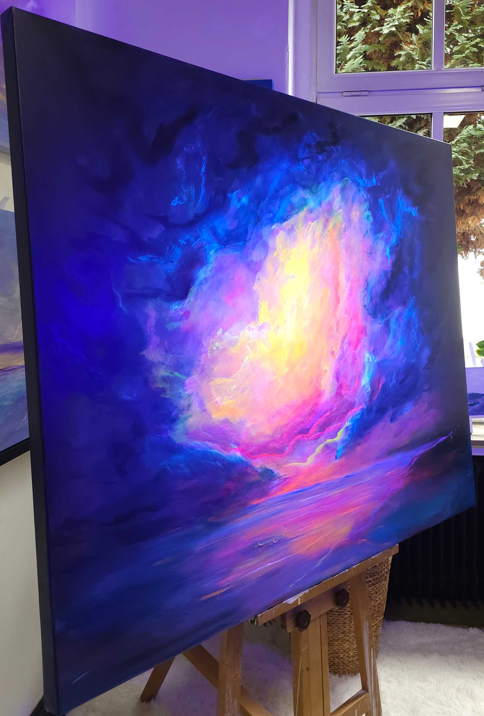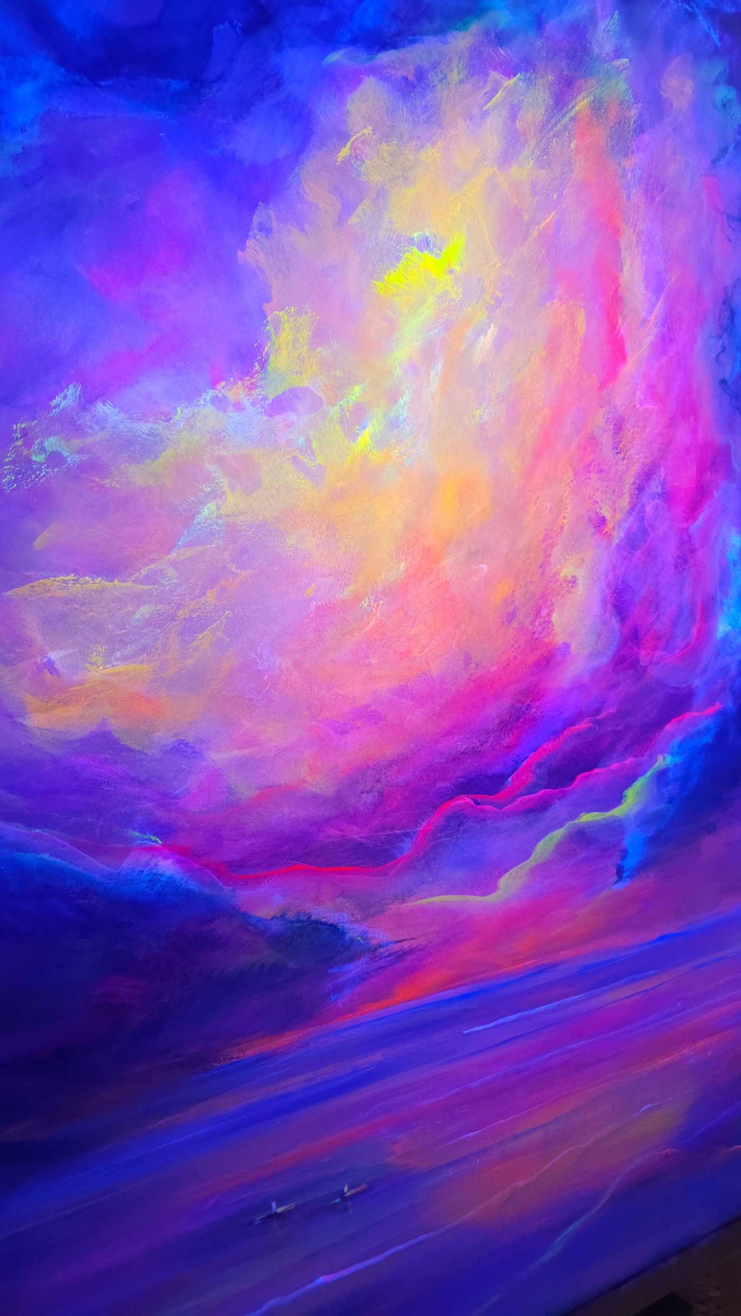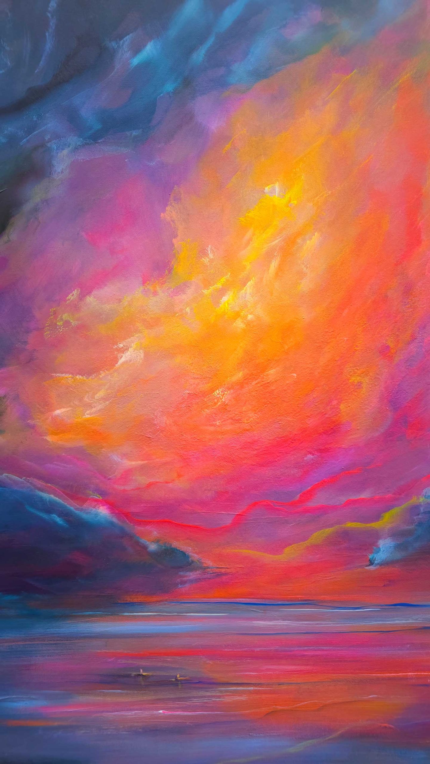 Ein Himmel voller Energie – Sky of Colors ist ein großformatiges Gemälde (120 x 150 cm), das mit intensiven Blau-, Pink-, Orange- und Gelbtönen ein vibrierendes Farbfeuerwerk entfaltet. Die leuchtenden Bereiche aus Neonfarbe setzen kraftvolle Akzente, die je nach Lichteinfall schimmern und das Bild lebendig wirken lassen.