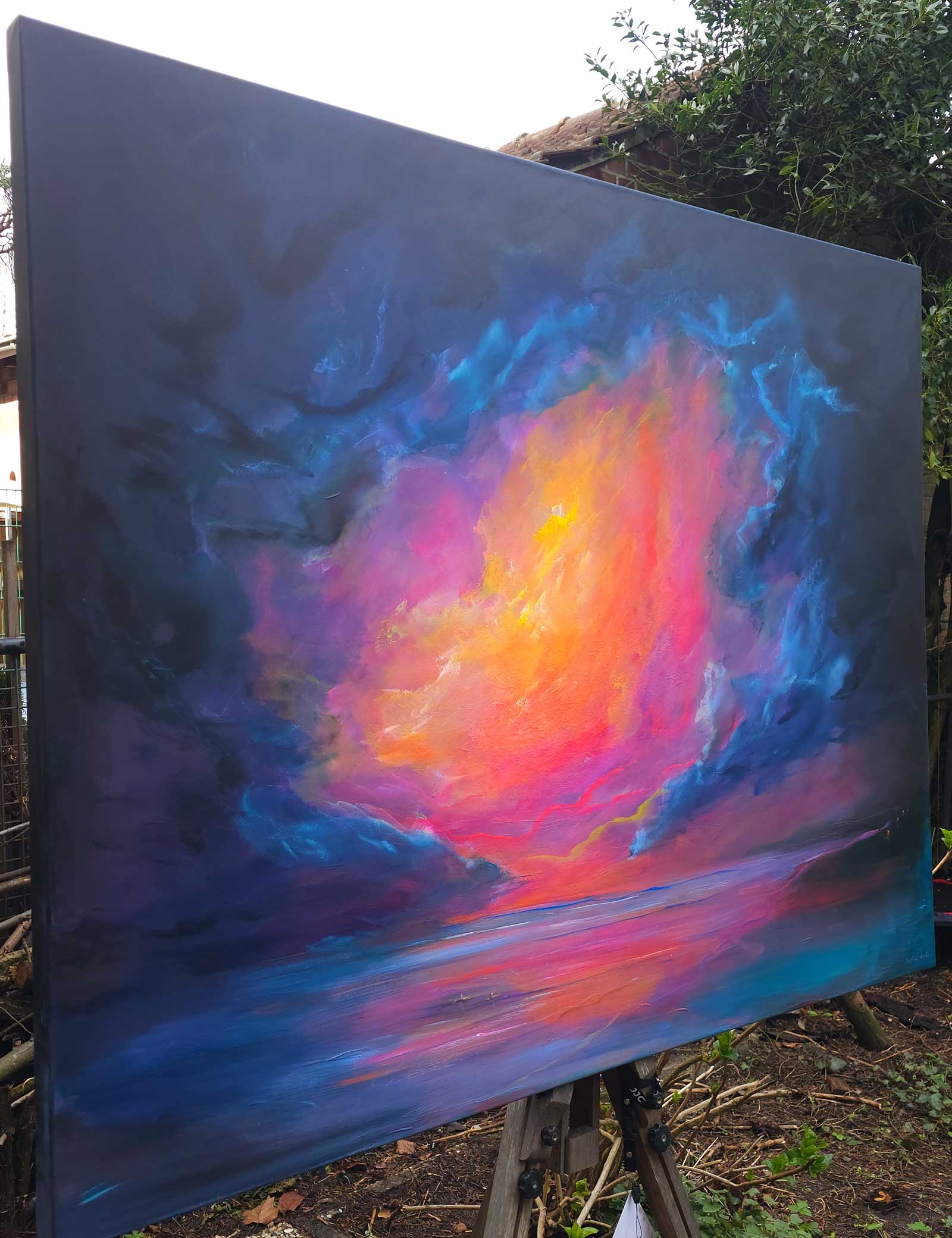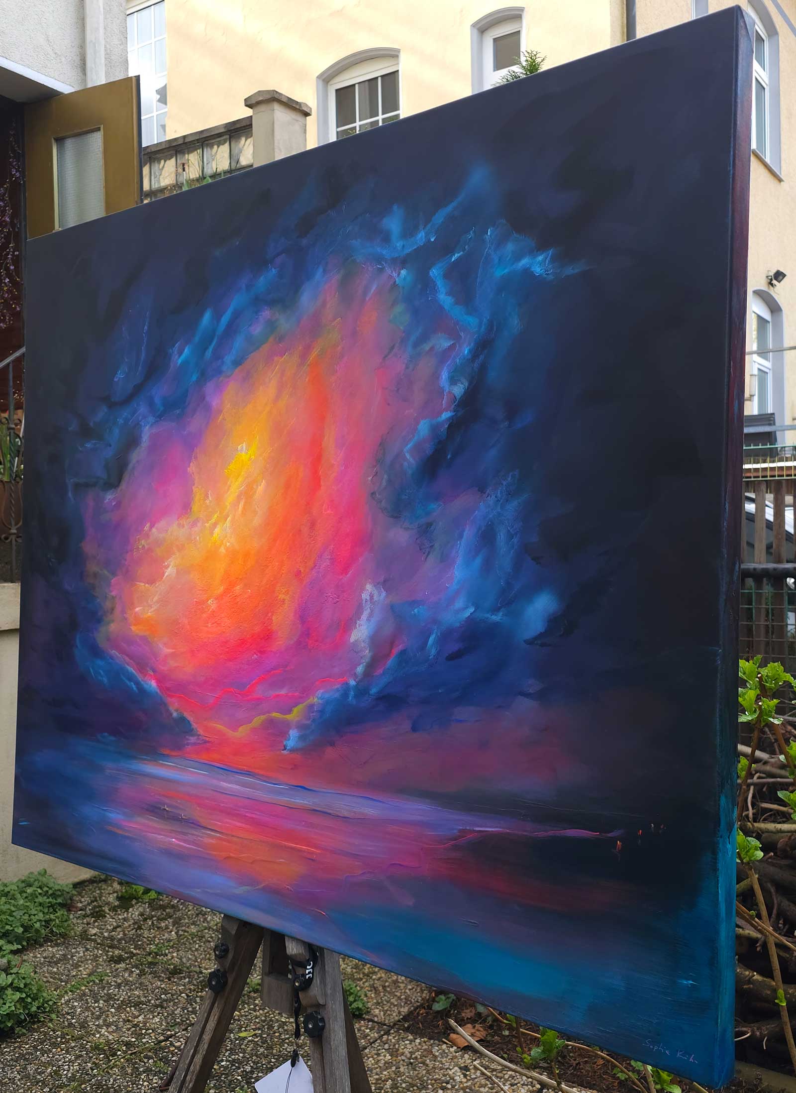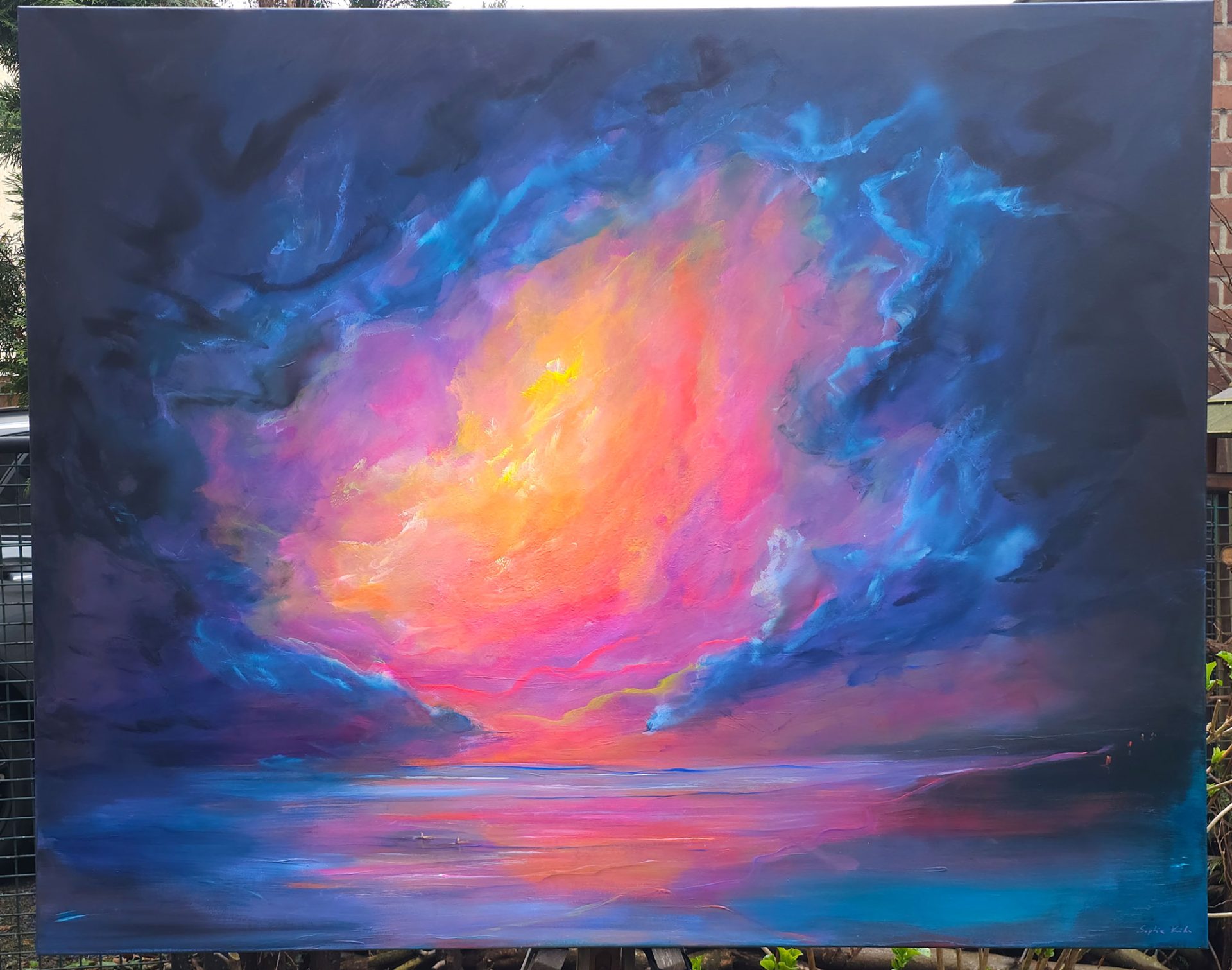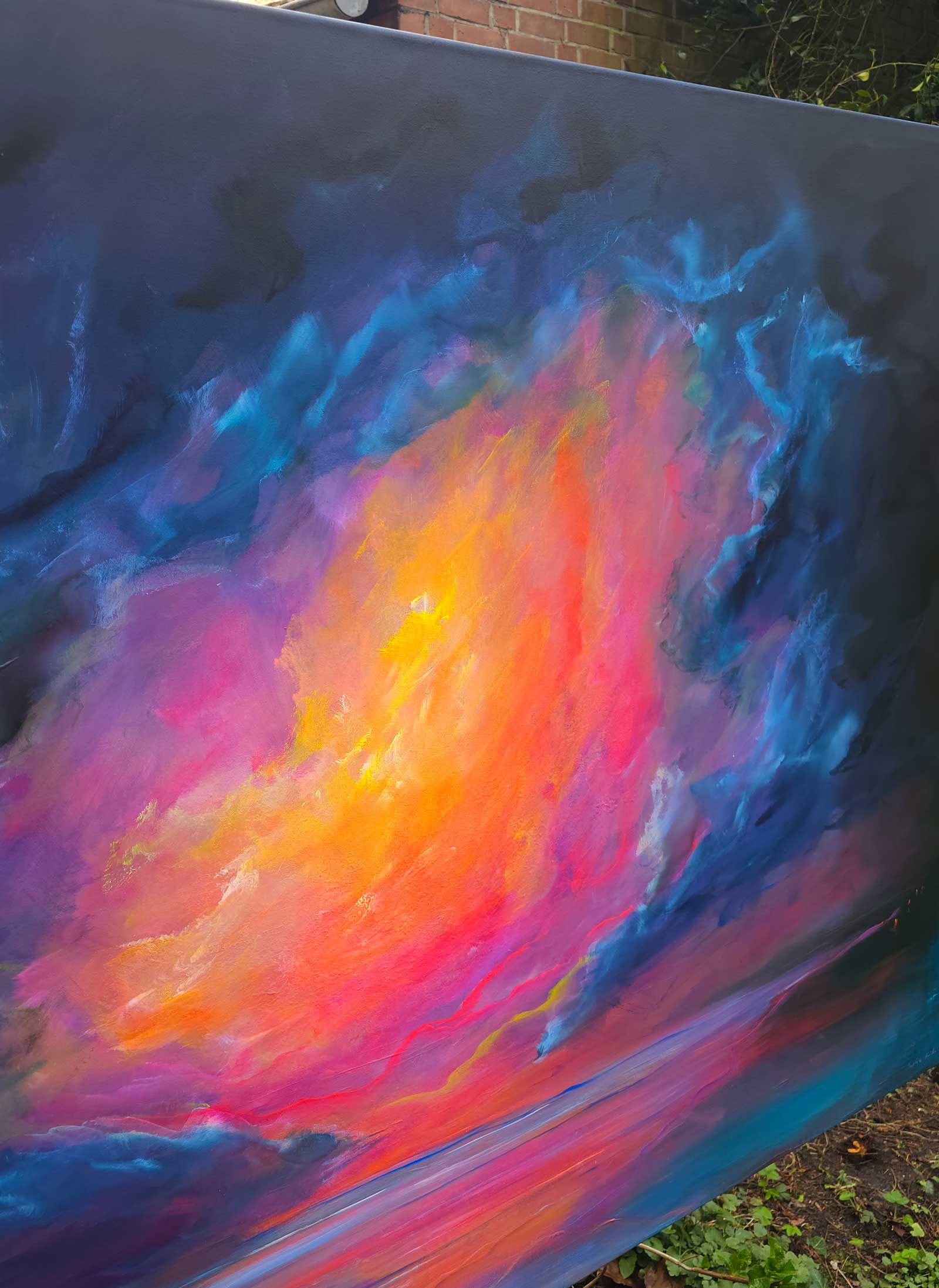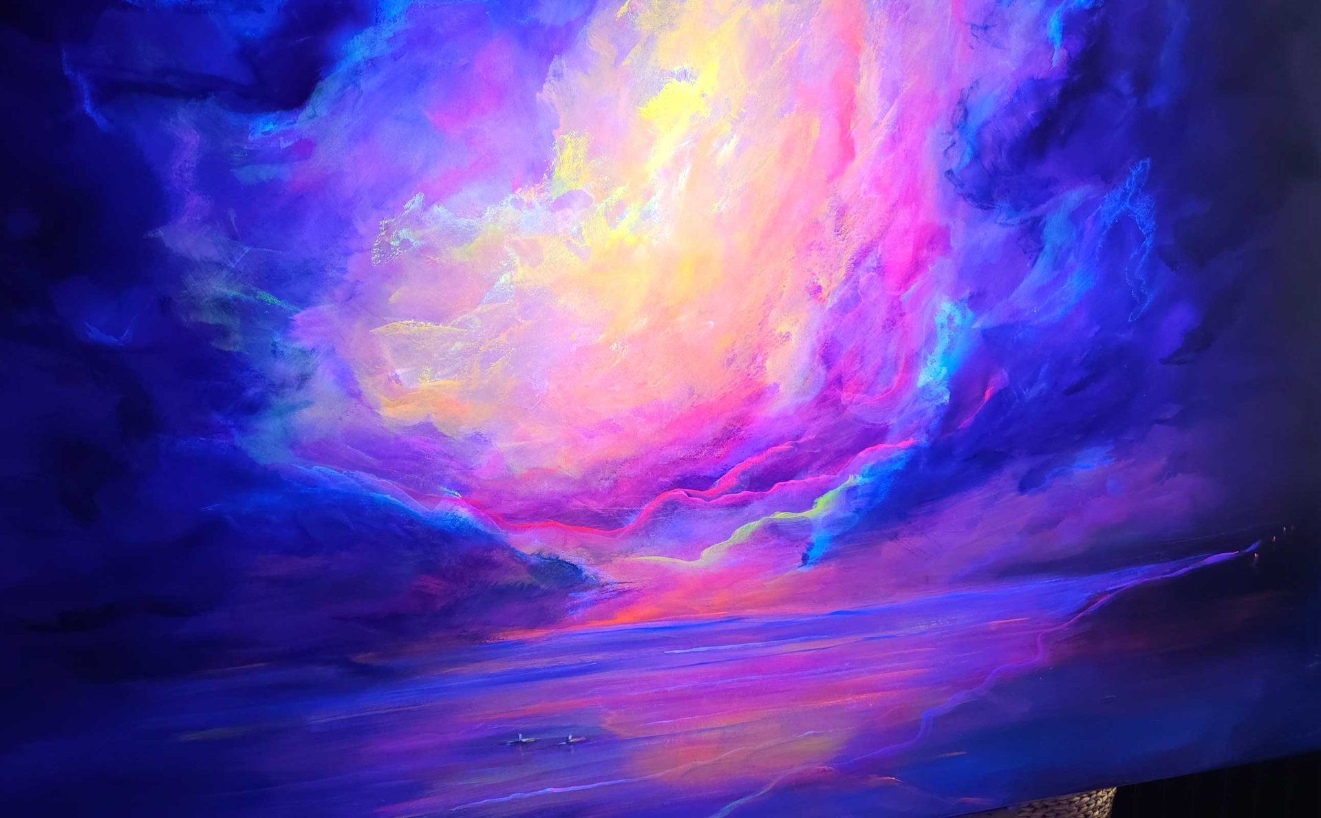 Ein Himmel voller Energie – Sky of Colors ist ein großformatiges Gemälde (120 x 150 cm), das mit intensiven Blau-, Pink-, Orange- und Gelbtönen ein vibrierendes Farbfeuerwerk entfaltet. Die leuchtenden Bereiche aus Neonfarbe setzen kraftvolle Akzente, die je nach Lichteinfall schimmern und das Bild lebendig wirken lassen.