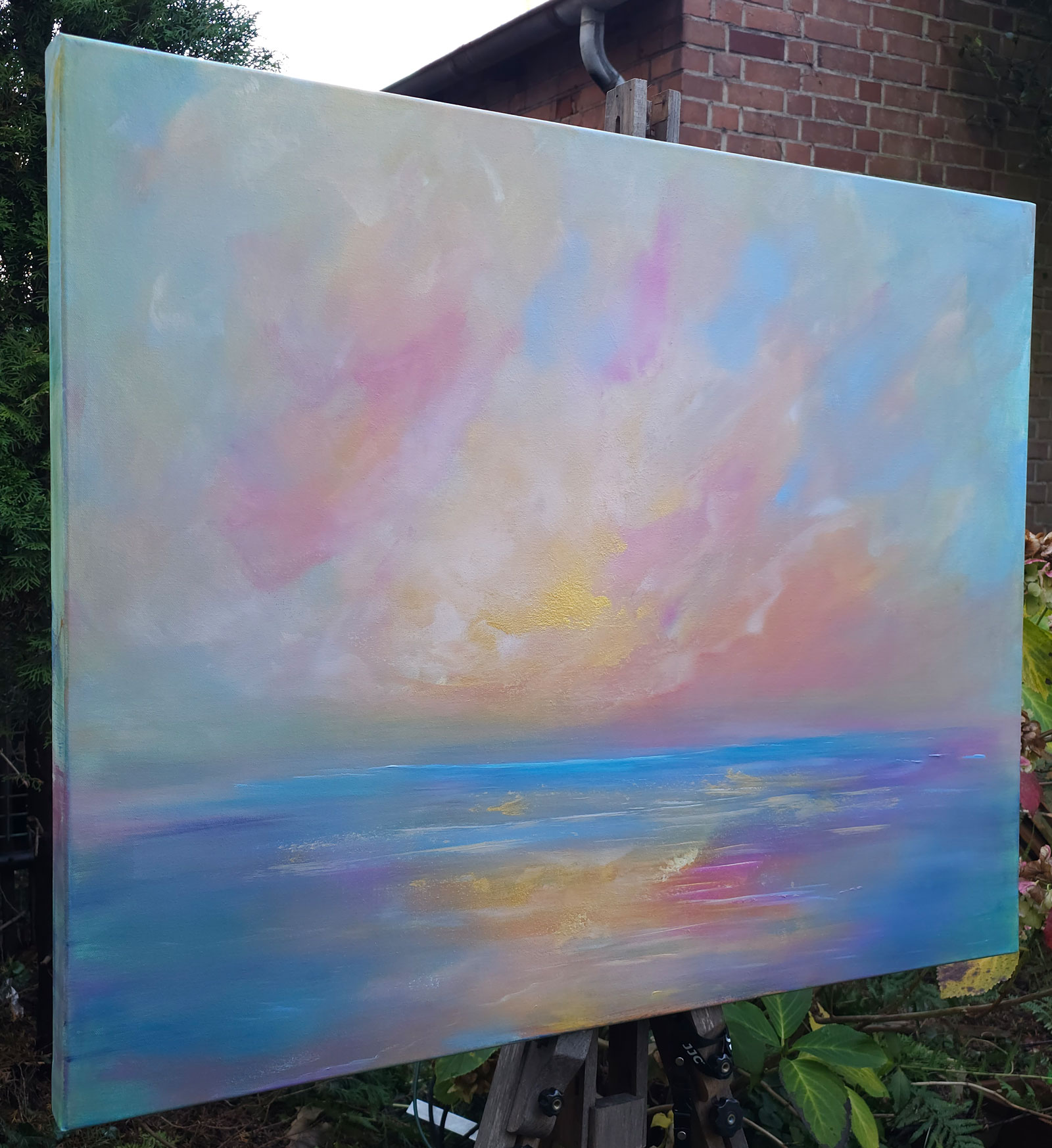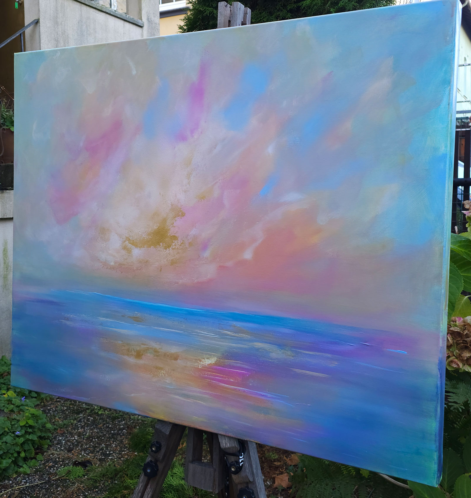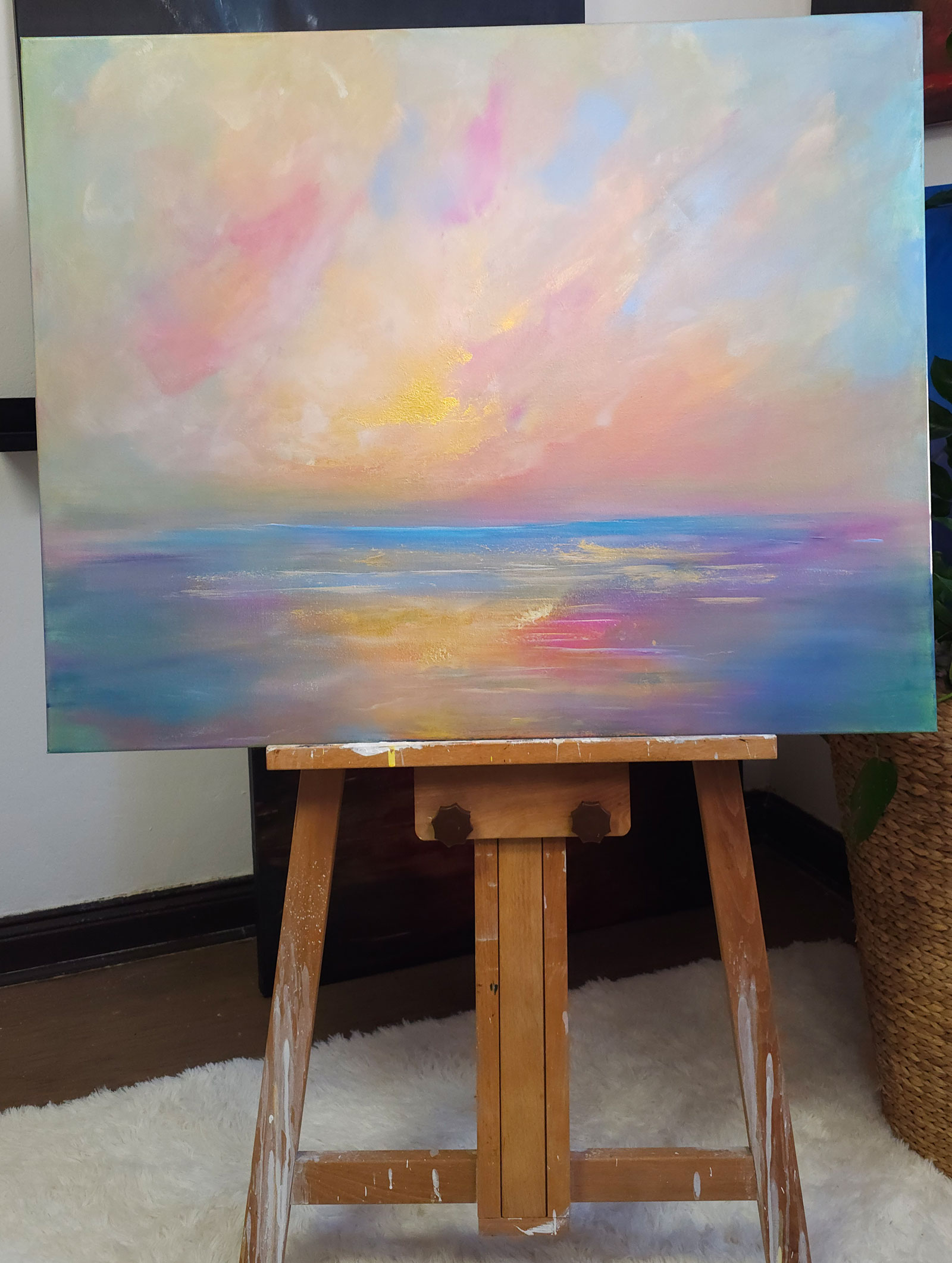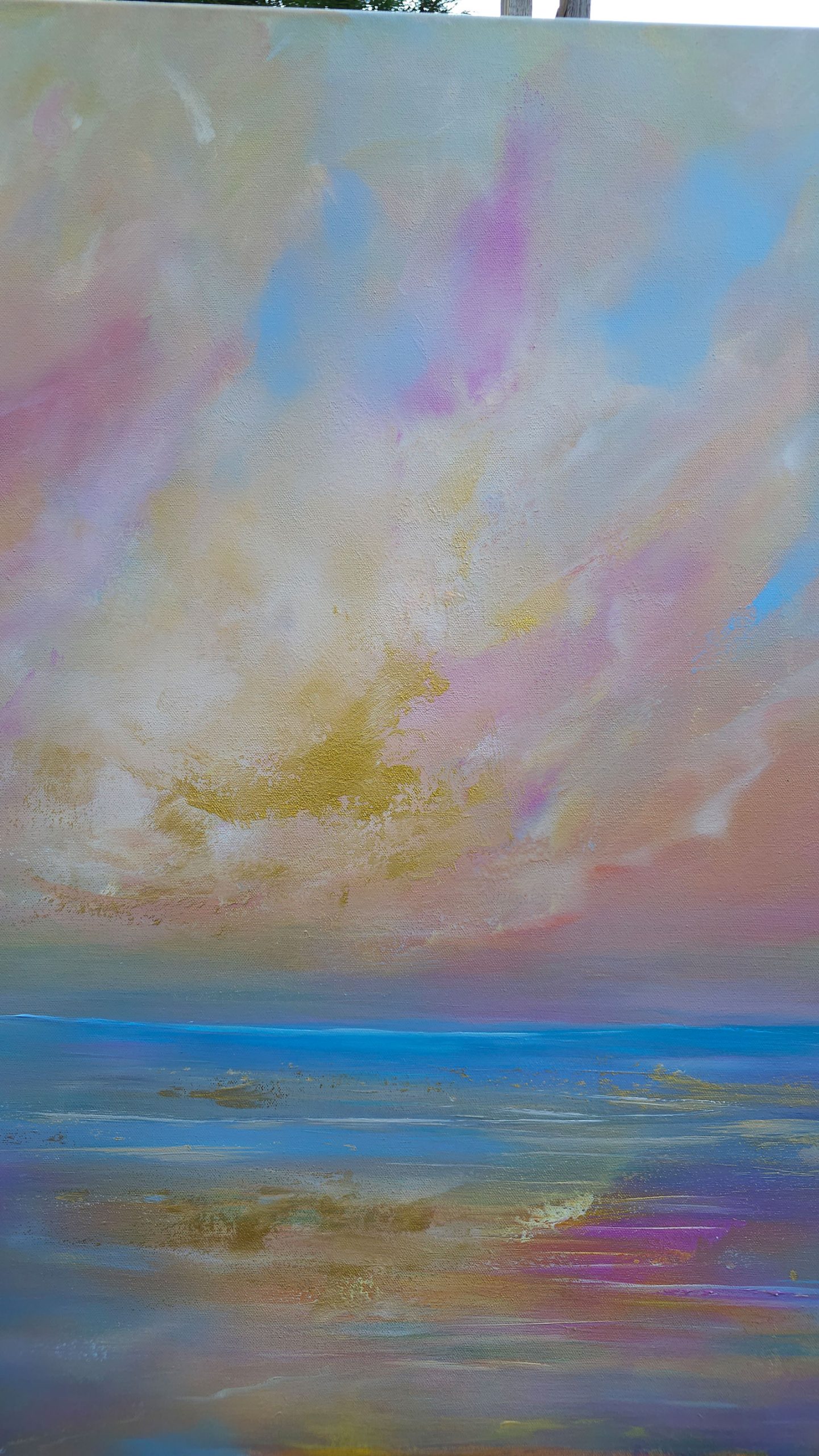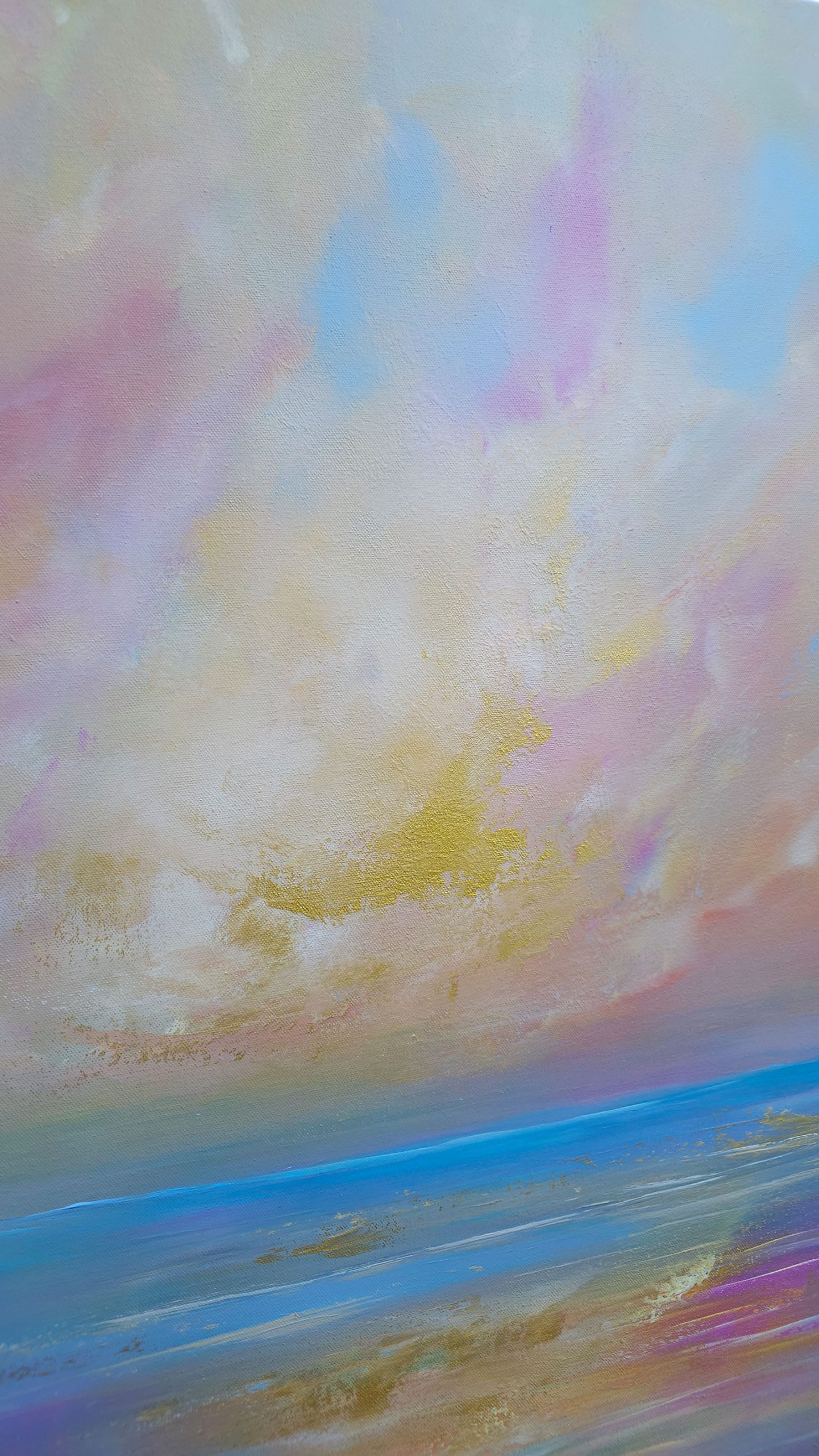 Ein stilles Leuchten breitet sich über Meer und Himmel aus, zarte Töne von Rosa, Gelb und Türkis verschmelzen zu einer harmonischen, fast schwerelosen Lichtstimmung. Das Bild wirkt wie ein Atemzug der Natur, ein Moment zwischen Erwachen und Ruhe.