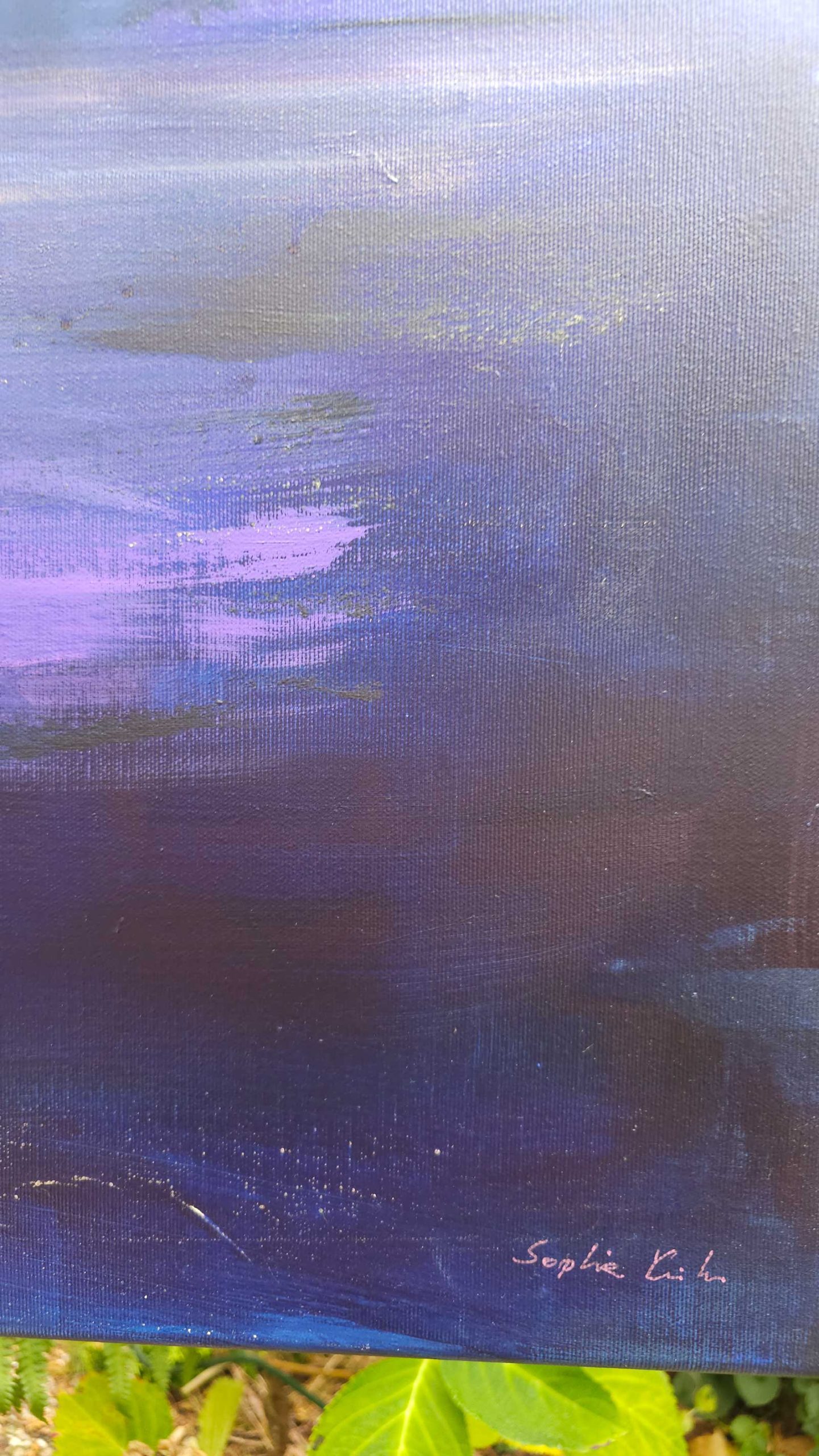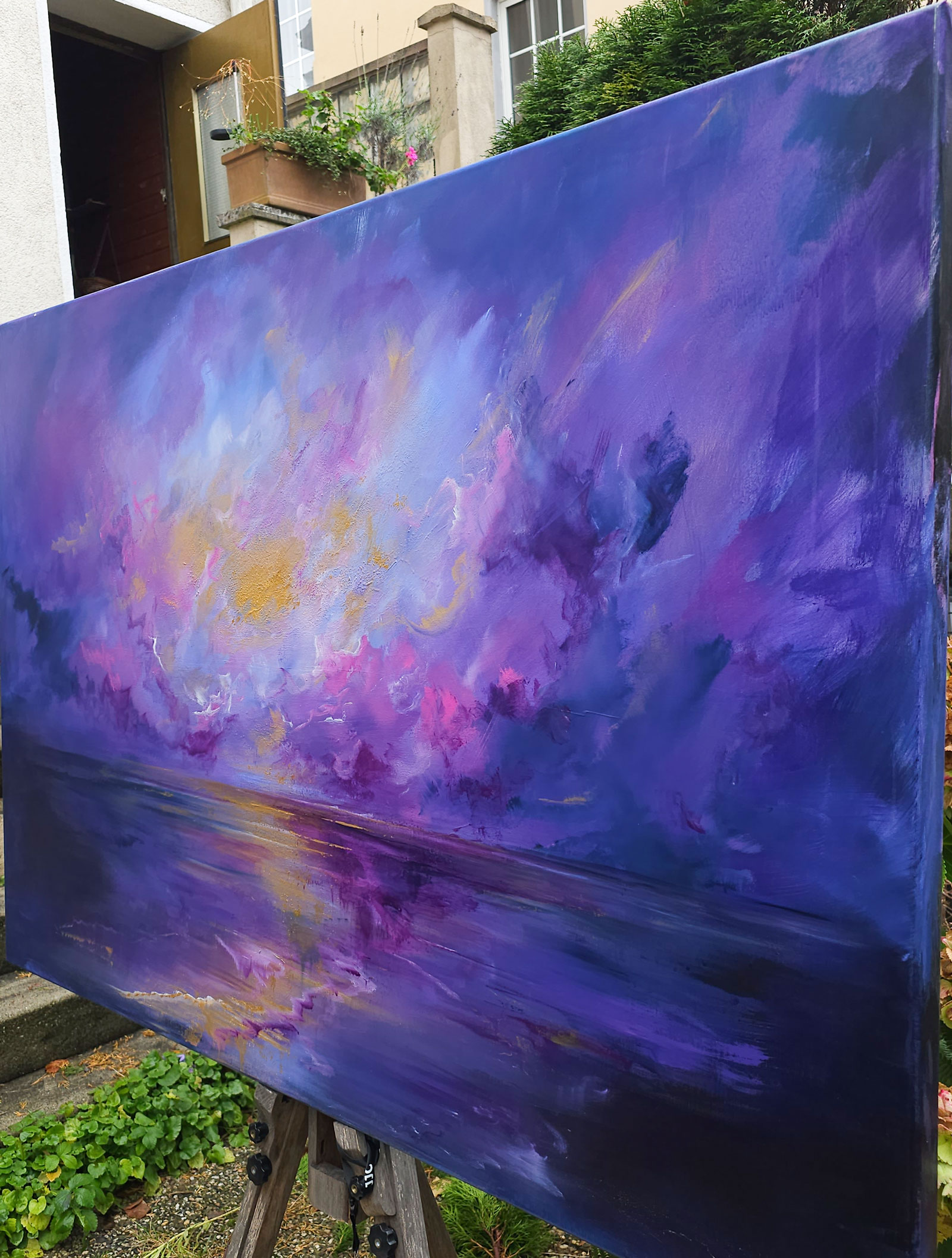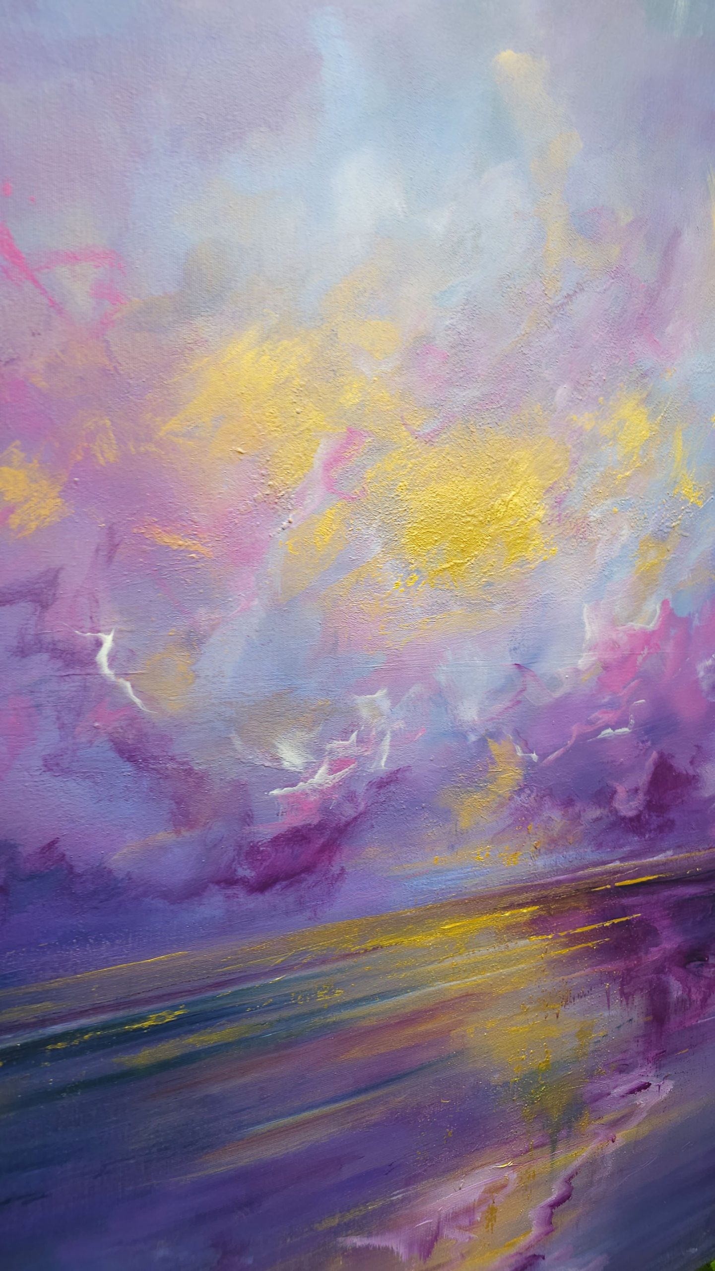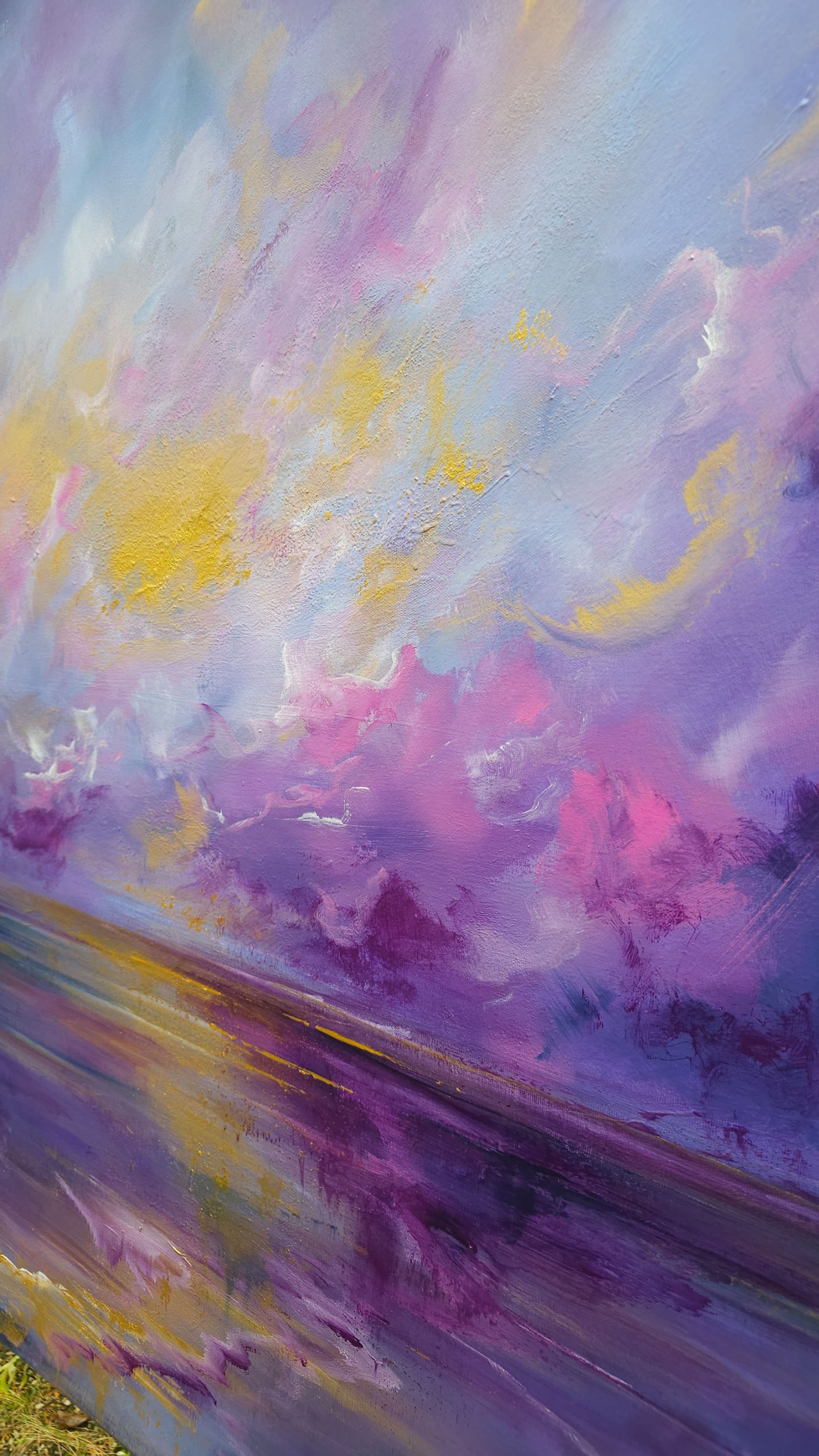Water Dreams ist ein poetisches Acrylgemälde im Format 100 x 150 cm, das mit seiner traumhaften Farbgebung aus Violett, Pink, Blau und zartem Gelb ein Gefühl von Leichtigkeit und Stille vermittelt. Wie ein Moment zwischen Sonnenaufgang und Dämmerung zieht dieses Werk den Betrachter in eine atmosphärische Welt voller Lichtreflexe und Spiegelungen.