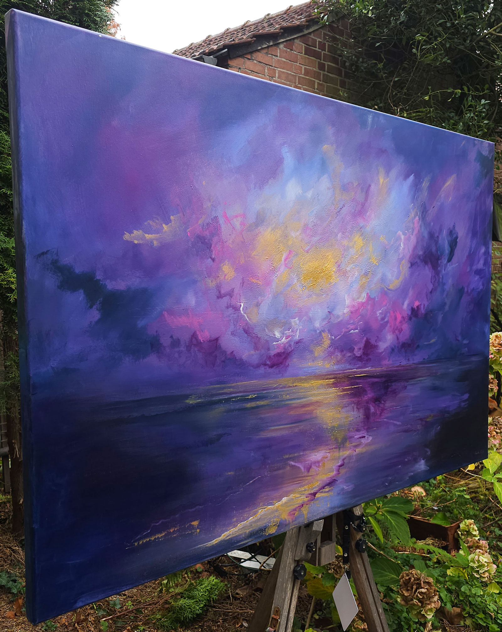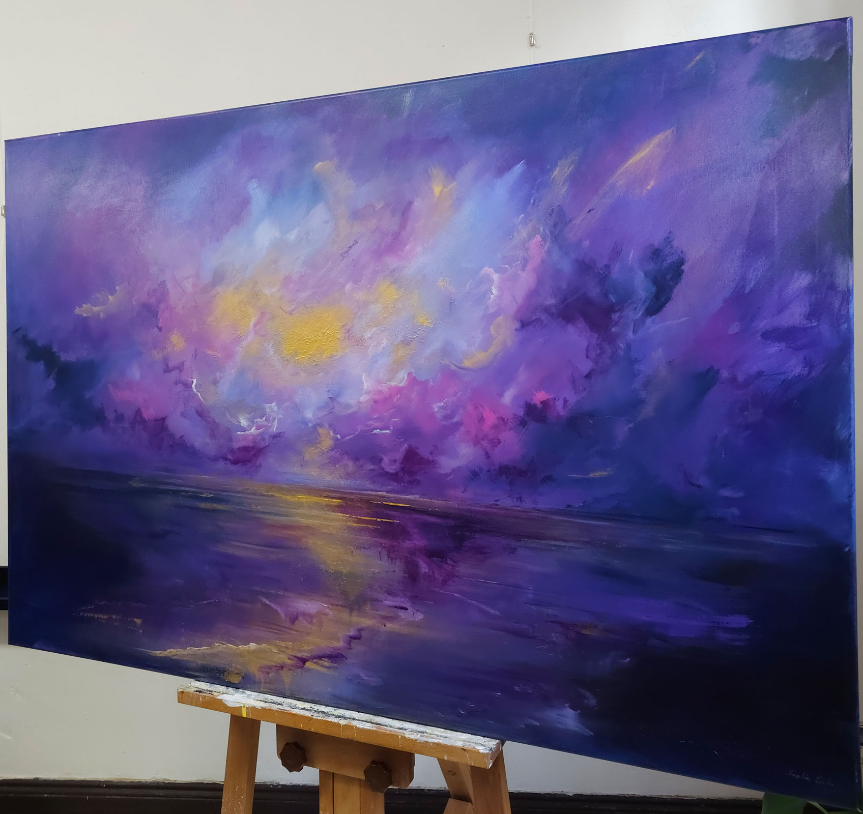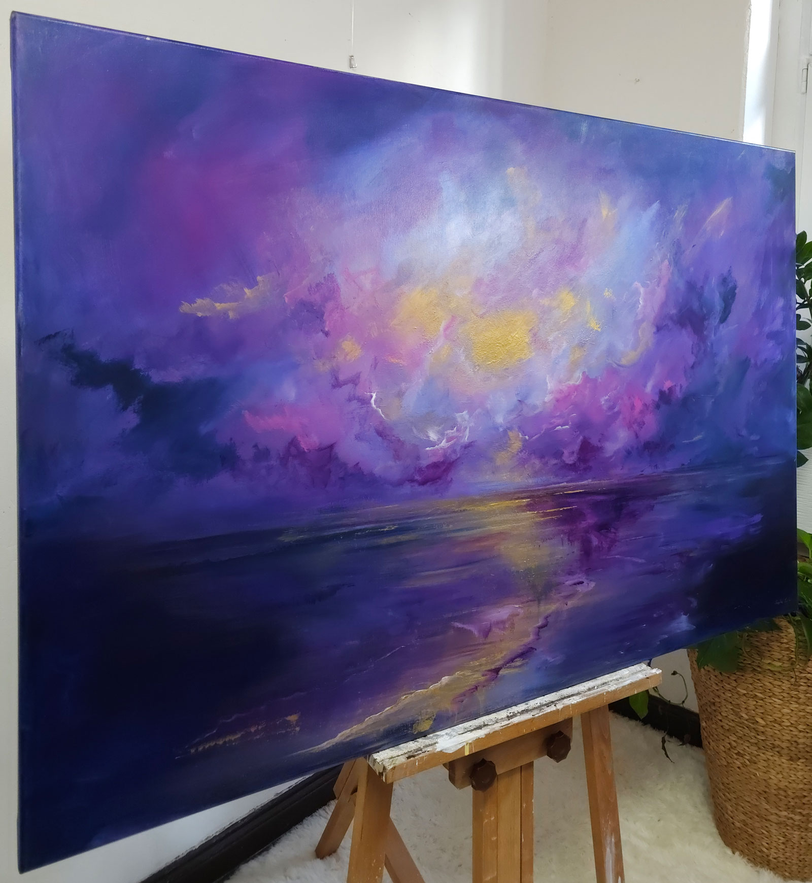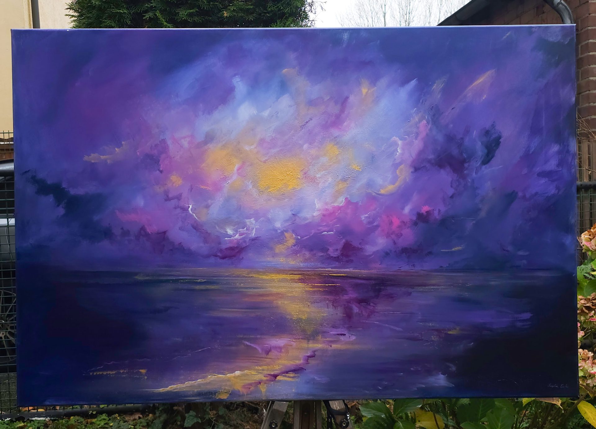 Water Dreams ist ein poetisches Acrylgemälde im Format 100 x 150 cm, das mit seiner traumhaften Farbgebung aus Violett, Pink, Blau und zartem Gelb ein Gefühl von Leichtigkeit und Stille vermittelt. Wie ein Moment zwischen Sonnenaufgang und Dämmerung zieht dieses Werk den Betrachter in eine atmosphärische Welt voller Lichtreflexe und Spiegelungen.