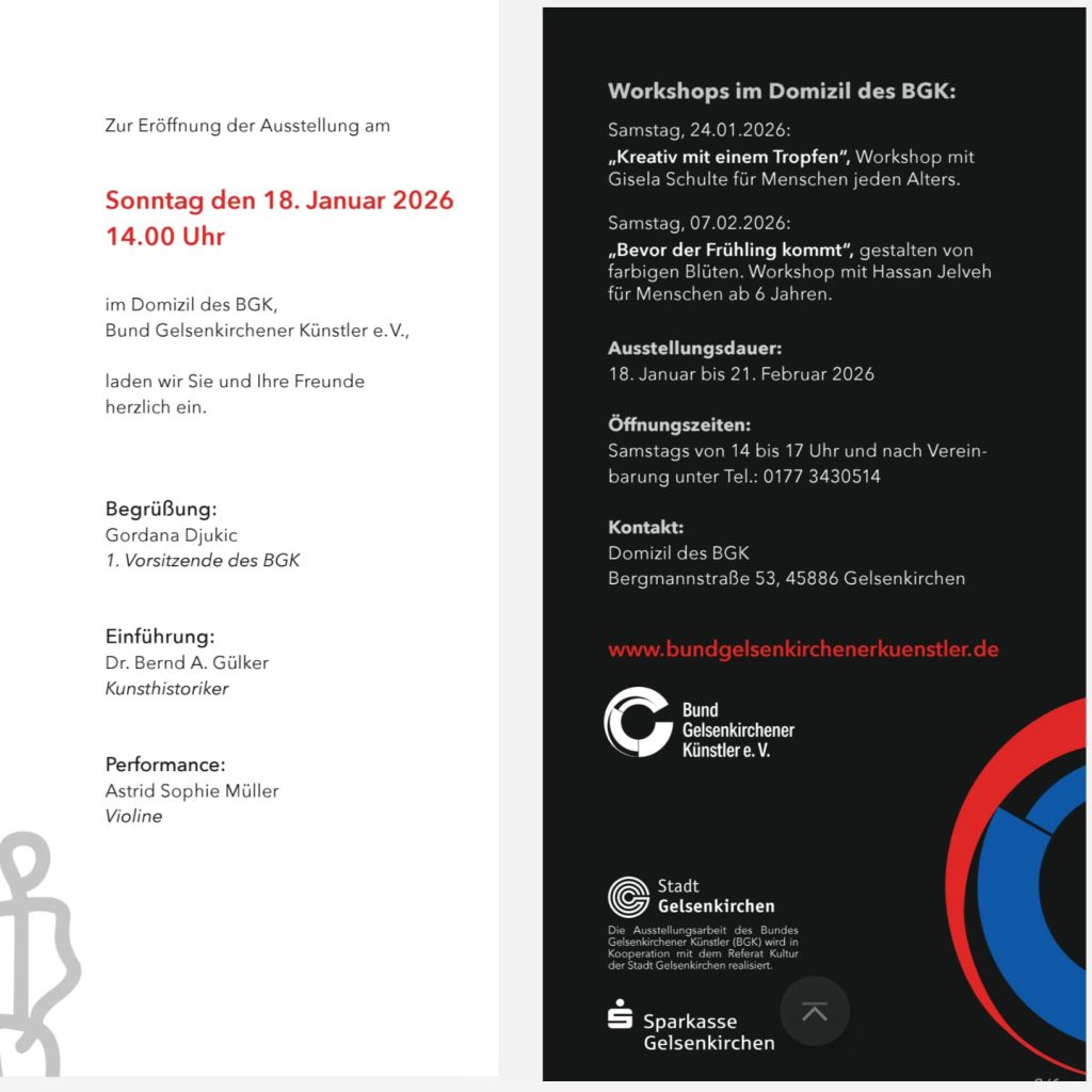 Zur Eröffnung sprechen Gordana Djukic (1. Vorsitzende des BGK) und Dr. Bernd A. Gülker (Kunsthistoriker). Musikalisch begleitet wird die Eröffnung durch eine Violin-Performance von Astrid Sophie Müller.